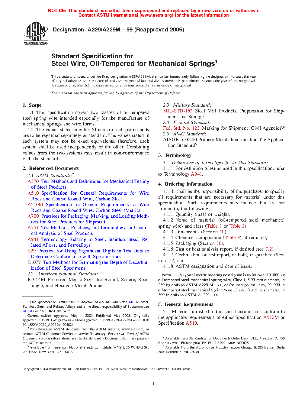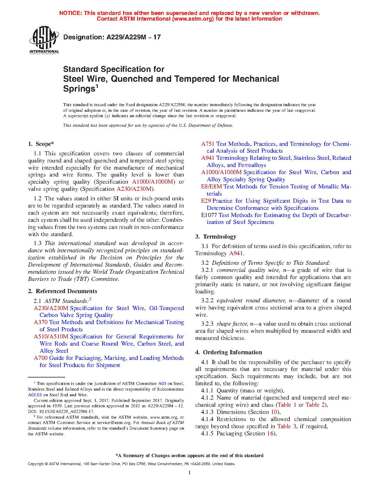 1.1 This specification covers two classes of commercial quality round and shaped quenched and tempered steel spring wire intended especially for the manufacture of mechanical springs and wire forms. The quality level is lower than specialty spring quality (Specification A1000/A1000M) or valve spring quality (Specification A230/A230M).