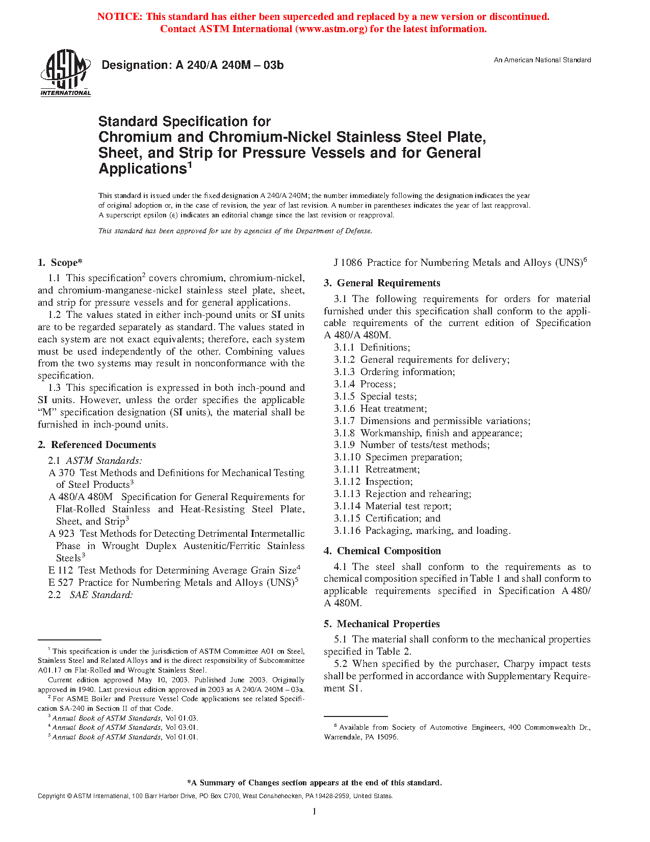 This specification covers chromium, chromium-nickel, and chromium-manganese-nickel stainless steel plate, sheet, and strip for pressure vessels and for general applications. The steel shall conform to the requirements as to chemical composition specified. The material shall conform to the mechanical properties specified.