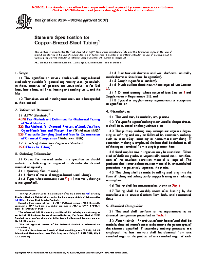 This specification covers double-wall, copper brazed steel tubing suitable for general engineering uses, particularly in the automotive, refrigeration, and stove industries for fuel lines, brake lines, oil lines, heating and cooling units, and the like. The tubing shall be made by rolling steel strip into the form of tubing and subsequently copper brazing in a reducing atmosphere. The steel shall conform to the prescribed chemical composition and shall be subjected to heat analysis and product analysis. Tension, flattening, expansion, bending, and pressure proof tests shall be made in accordance with the specification.