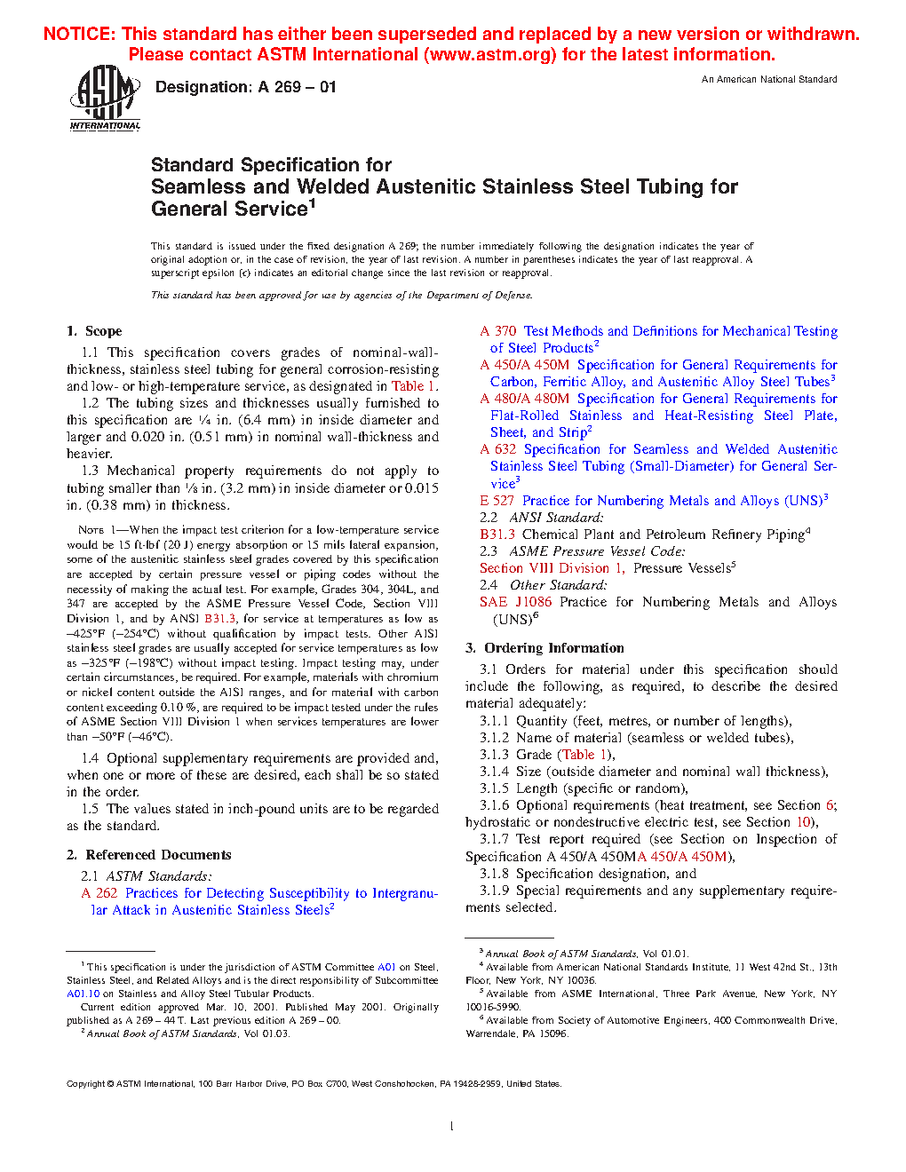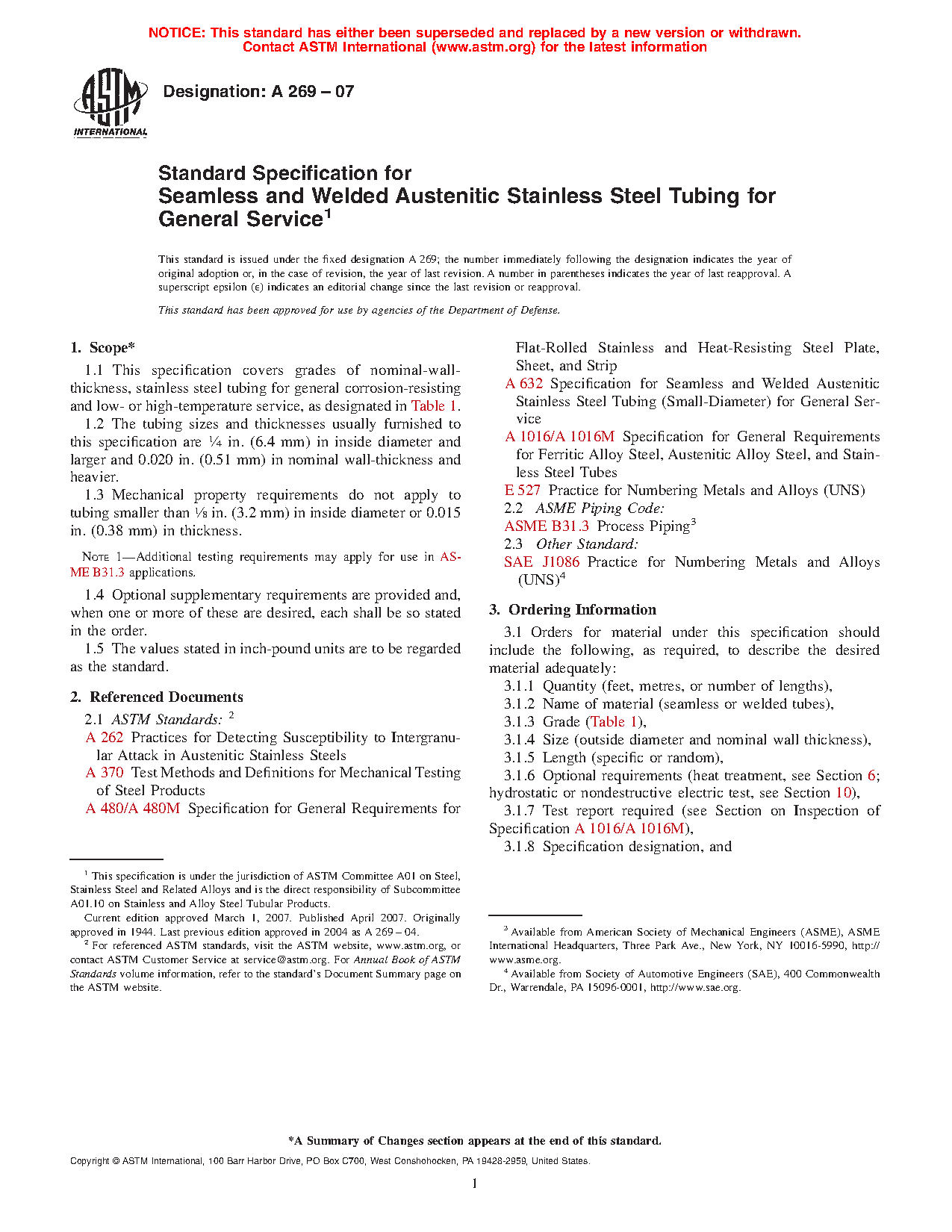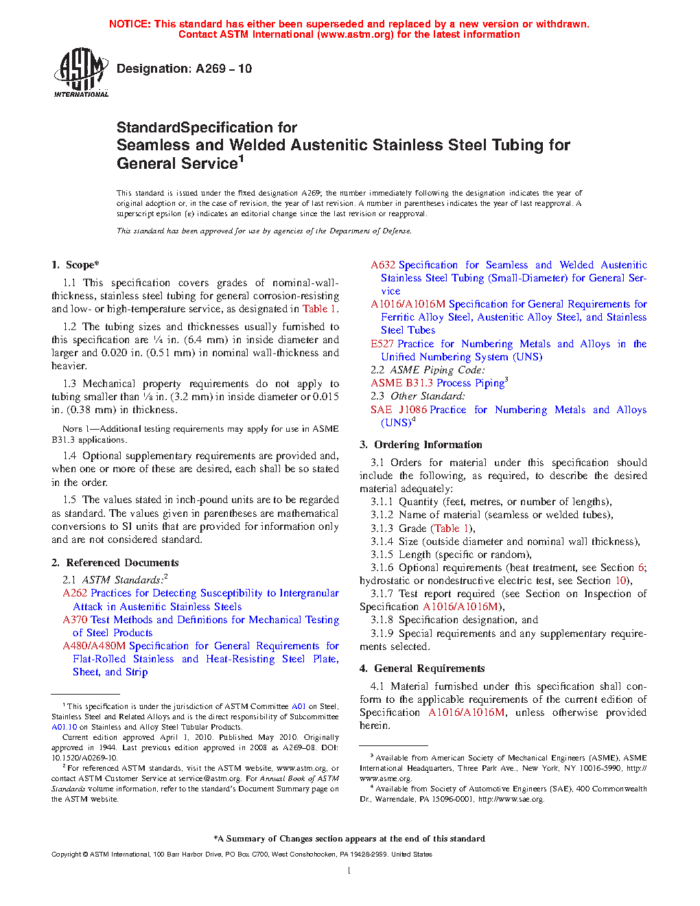 This specification covers nominal-wall-thickness, seamless and welded austenitic steel tubing for general corrosion-resisting and low- or high-temperature service. All material shall be furnished in the heat-treated condition. The steel shall conform to the chemical composition requirements. Different mechanical test requirements that includes, flaring test, flange test, hardness test, and reverse flattening test are presented. Also, each tube shall be subjected to the non-destructive electric test or the hydrostatic test. Finally the hardness requirements for different grades of tubes are highlighted.