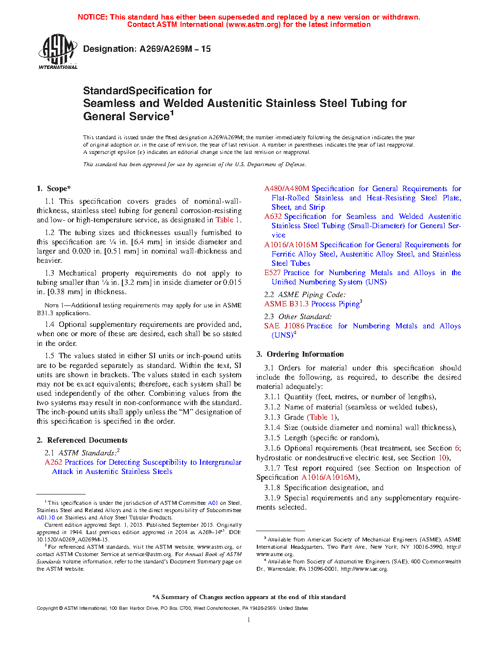 This specification covers nominal-wall-thickness, seamless and welded austenitic steel tubing for general corrosion-resisting and low- or high-temperature service. All material shall be furnished in the heat-treated condition. The steel shall conform to the chemical composition requirements. Different mechanical test requirements that includes, flaring test, flange test, hardness test, and reverse flattening test are presented. Also, each tube shall be subjected to the non-destructive electric test or the hydrostatic test. Finally the hardness requirements for different grades of tubes are highlighted.