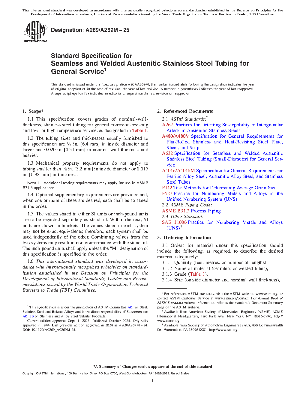 1.1 This specification covers grades of nominal-wall-thickness, stainless steel tubing for general corrosion-resisting and low- or high-temperature service, as designated in Table 1.