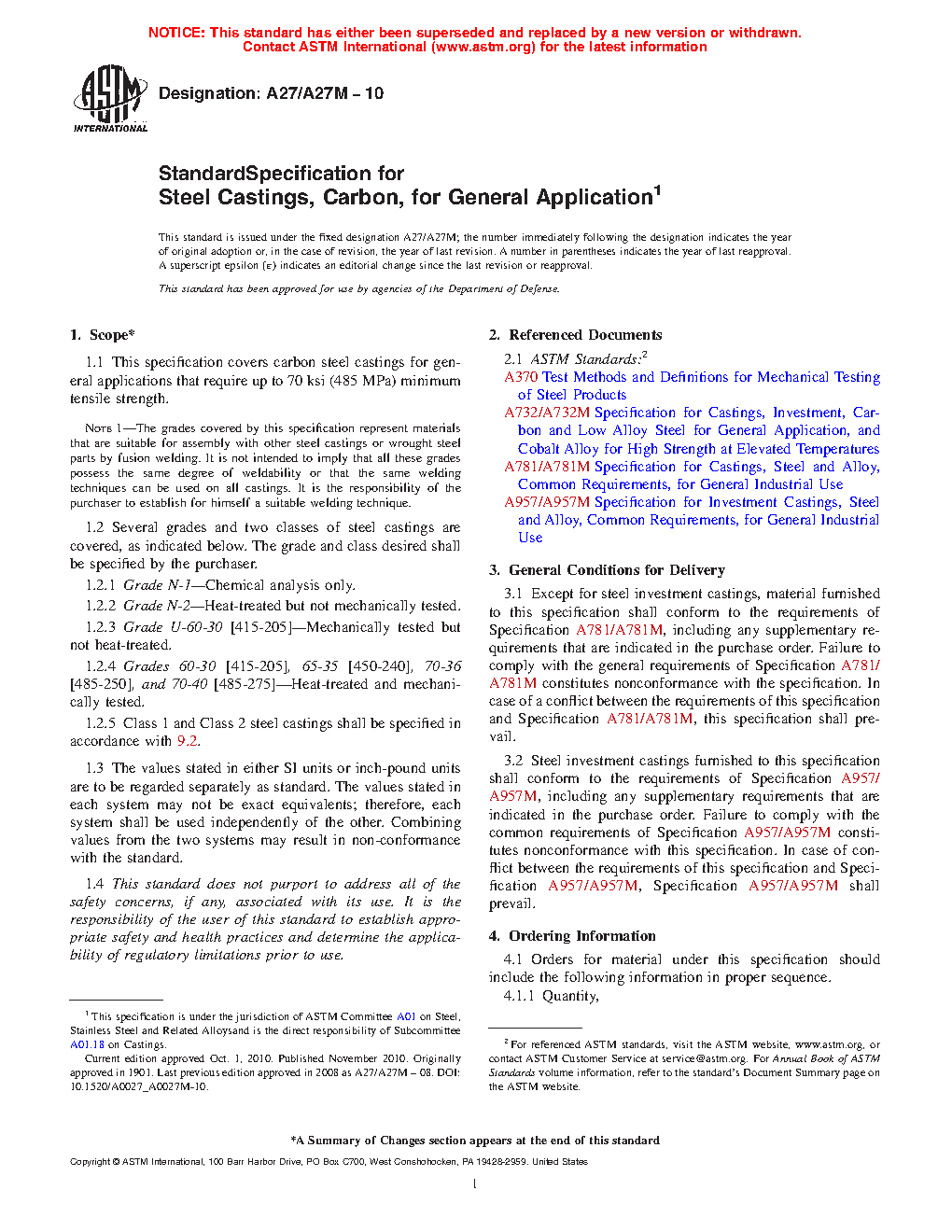 1.1 This specification covers carbon steel castings for general applications that require up to 70 ksi (485 MPa) minimum tensile strength.