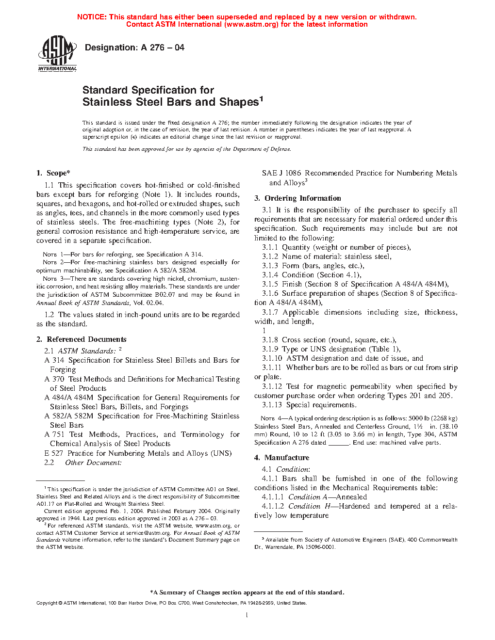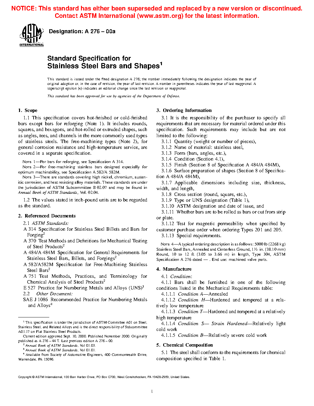 1.1 This specification covers hot-finished or cold-finished bars except bars for reforging (Note 1). It includes rounds, squares, and hexagons, and hot-rolled or extruded shapes, such as angles, tees, and channels in the more commonly used types of stainless steels. The free-machining types (Note 2), for general corrosion resistance and high-temperature service, are covered in a separate specification.