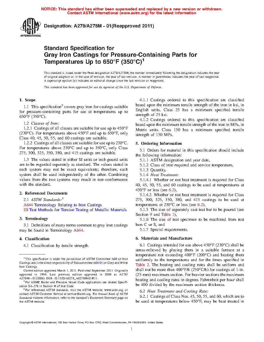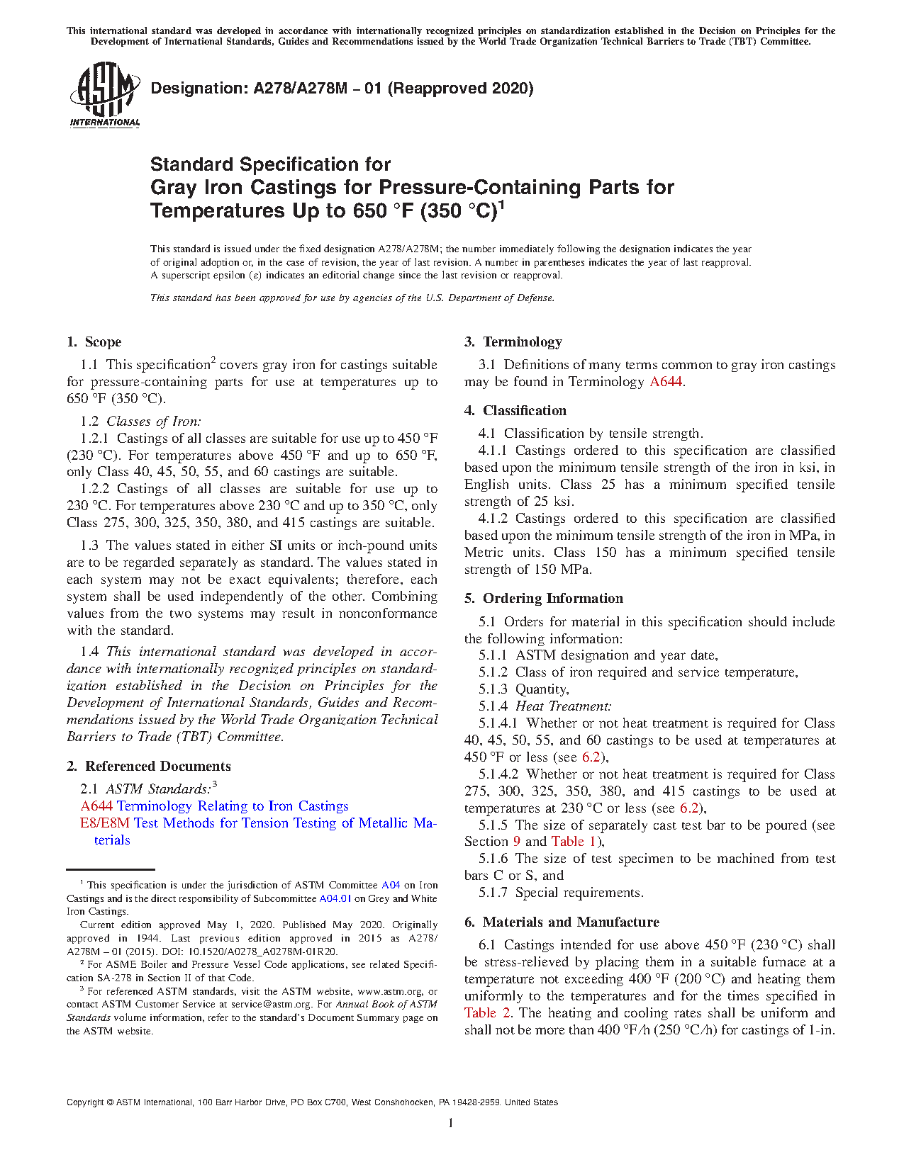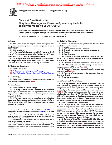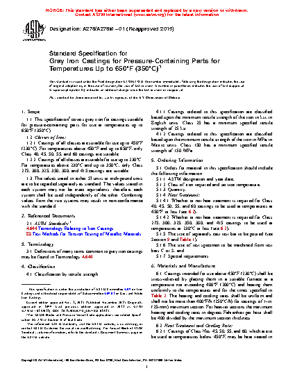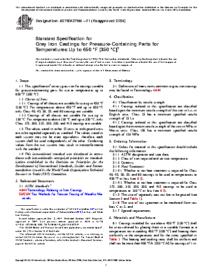 1.1 This specification covers gray iron for castings suitable for pressure-containing parts for use at temperatures up to 650°F (350°C).