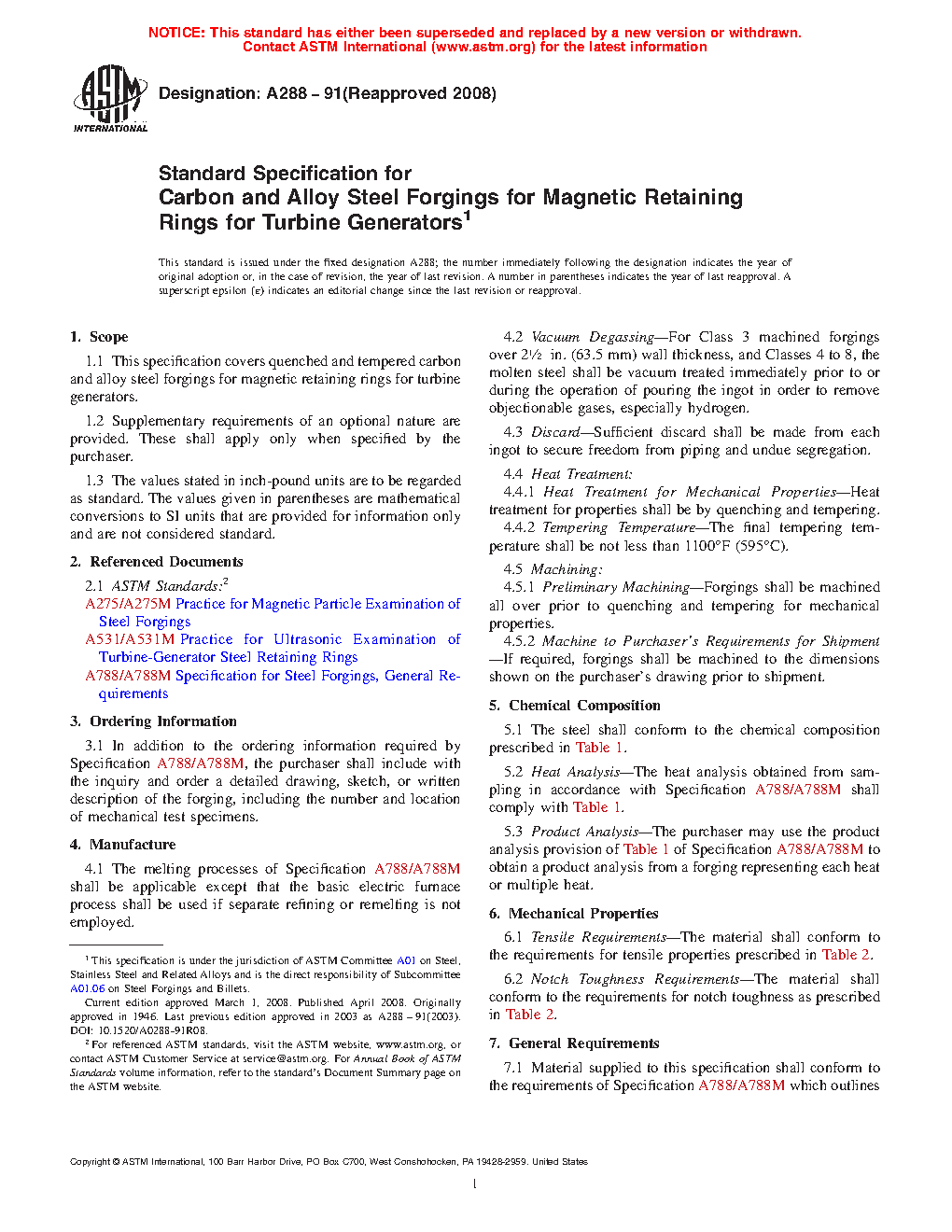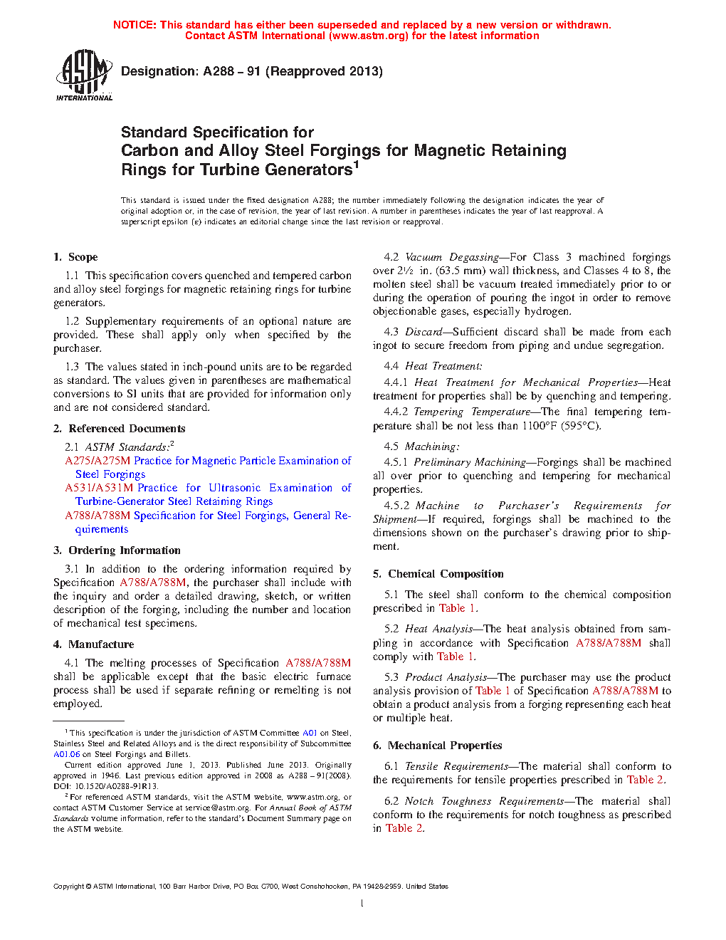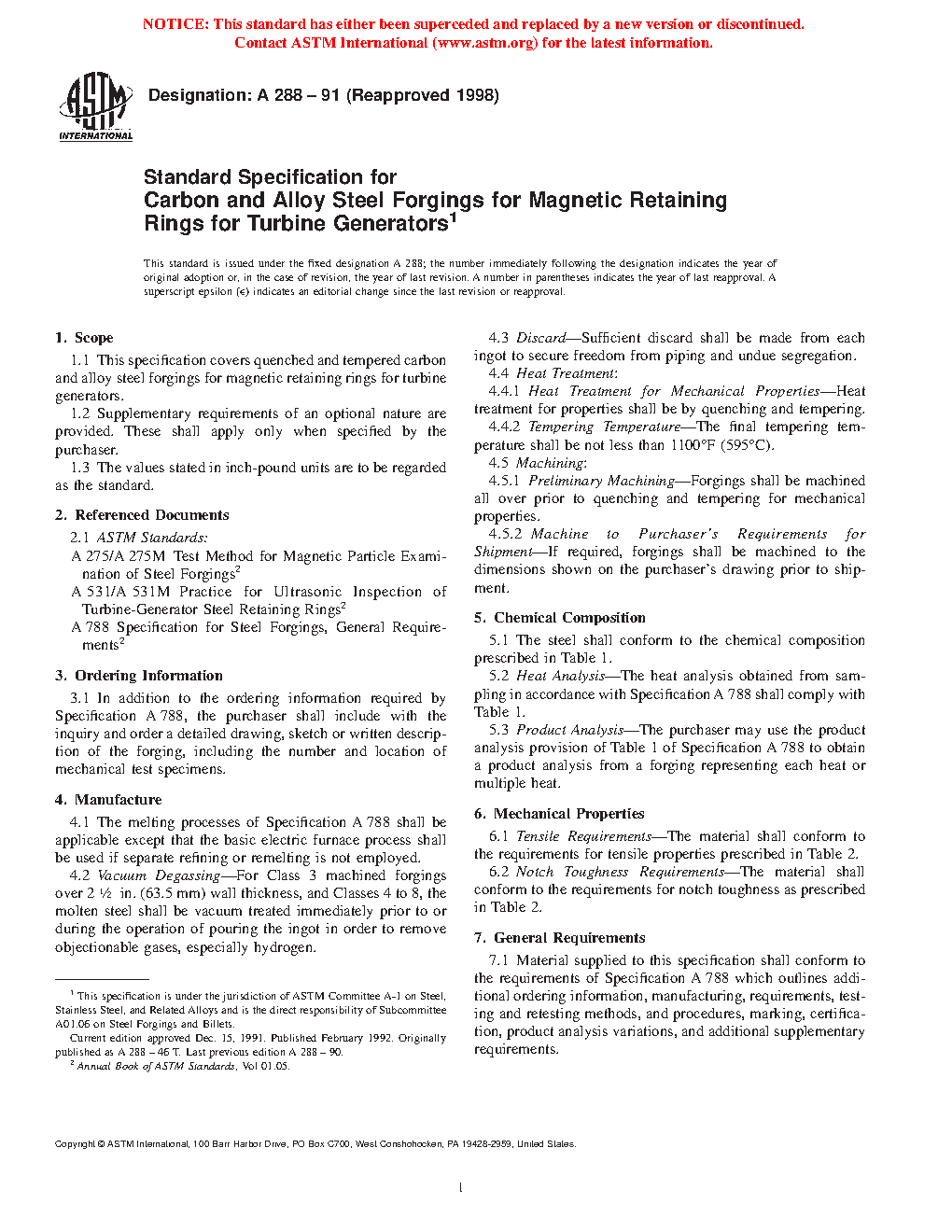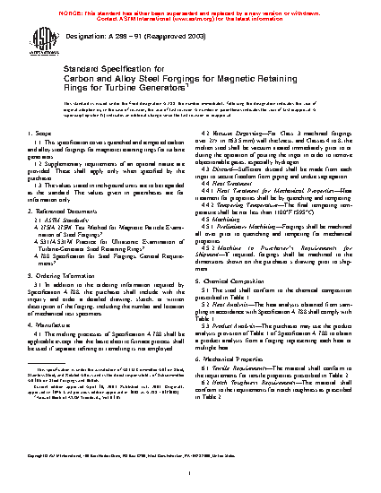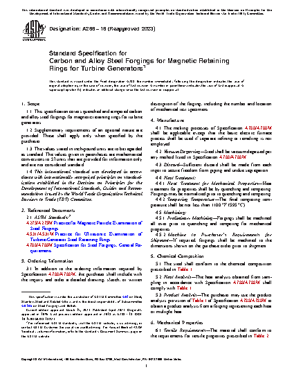 1.1 This specification covers quenched and tempered carbon and alloy steel forgings for magnetic retaining rings for turbine generators.