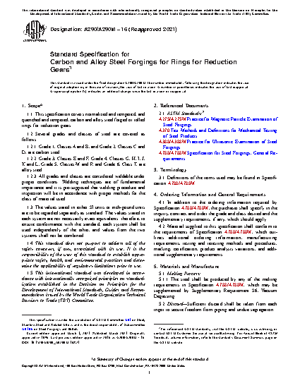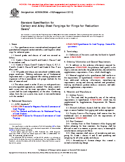 1.1 This specification covers normalized and tempered, and quenched and tempered, carbon and alloy steel forged or rolled rings for reduction gears.
