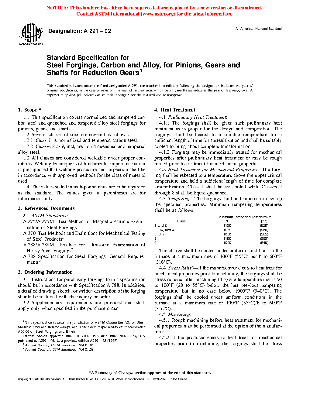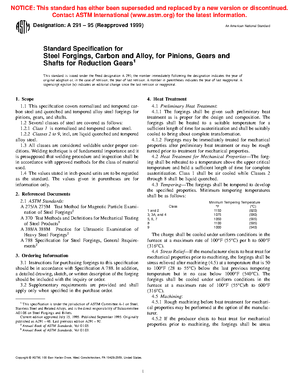 1.1 This specification covers normalized and tempered carbon steel and quenched and tempered alloy steel forgings for pinions, gears, and shafts.