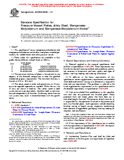 1.1 This specification2 covers manganese-molybdenum and manganese-molybdenum-nickel alloy steel plates intended particularly for welded boilers and other pressure vessels.