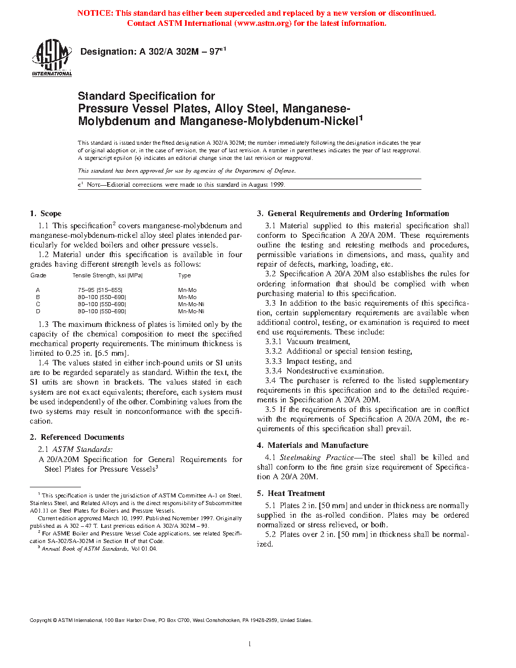 This specification covers manganese-molybdenum and manganese-molybdenum-nickel alloy steel plates intended particularly for welded boilers and other pressure vessels. According to their strength levels, the plates are available in four grades: Grades A, B, C, and D. The maximum thickness of plates is limited only by the capacity of the chemical composition to meet the specified mechanical property requirements. The steel shall be killed and shall conform to fine grain size requirements. The plates shall be subjected to tension test to determine the tensile strength, yield strength, and elongation.