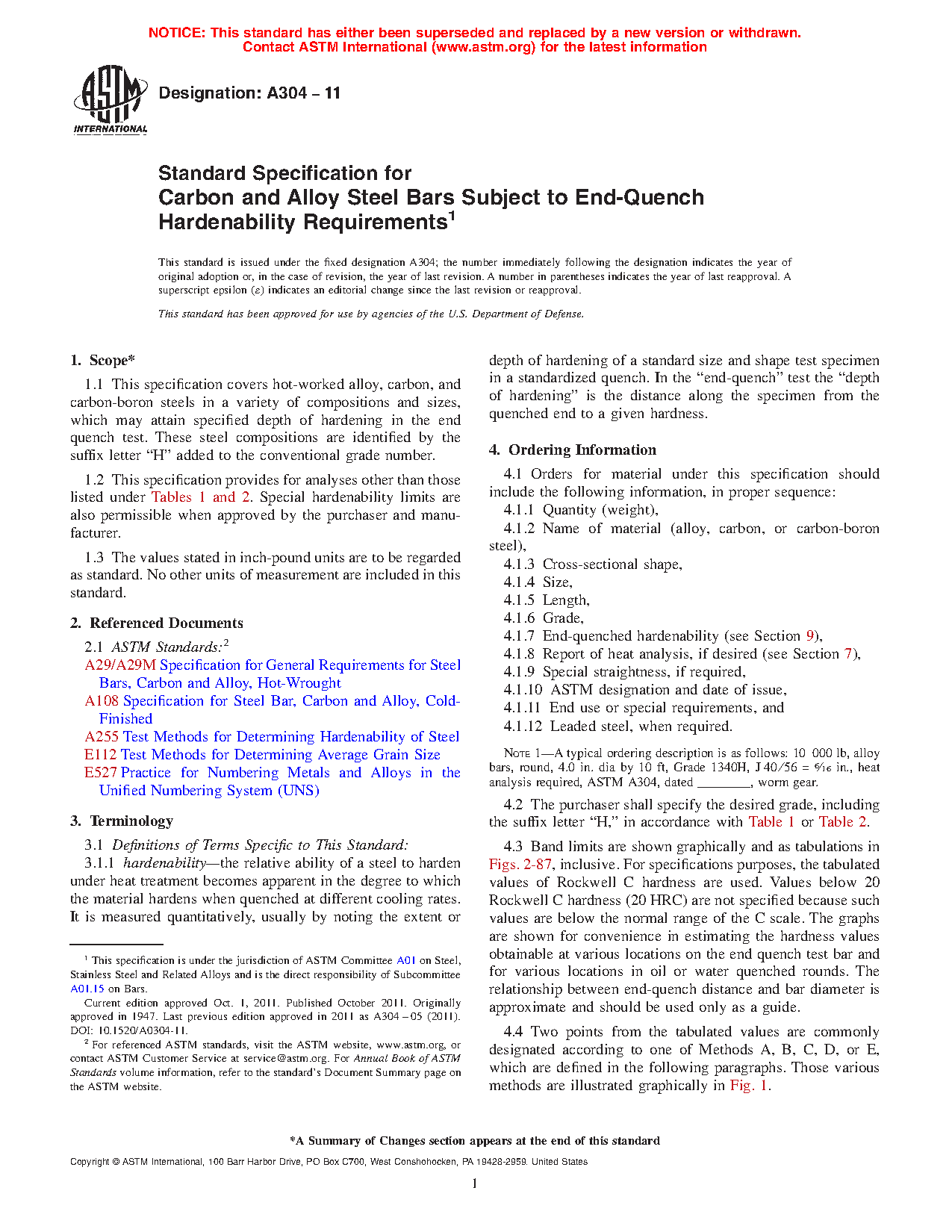 This specification covers carbon and alloy steel bars subject to end-quench hardenability requirements. The methods for estimating the hardness value of the material are presented. Method A is the minimum and maximum hardness values at any desired distance, Method B is the minimum and maximum distances at which any desired hardness value occurs, Method C is the two maximum hardness values at two desired distances, Method D is the two minimum hardness values at two desired distances, and Method E is any minimum hardness plus any maximum hardness. The heat analysis shall conform to the requirements as to chemical composition. The fine austenitic grain size requirements of the steel material are presented in details. The end-quench hardenability shall conform to the requirements specified on the purchase order. The test specimen requirements indicates that, the number and location of test specimens shall be in accordance with the manufacturers standard practice and shall adequately represent the hardenability of each heat, also, all forged or rolled hardenability test specimens must be normalized prior to testing. The grain size and end-quench hardenability test methods are presented in details.