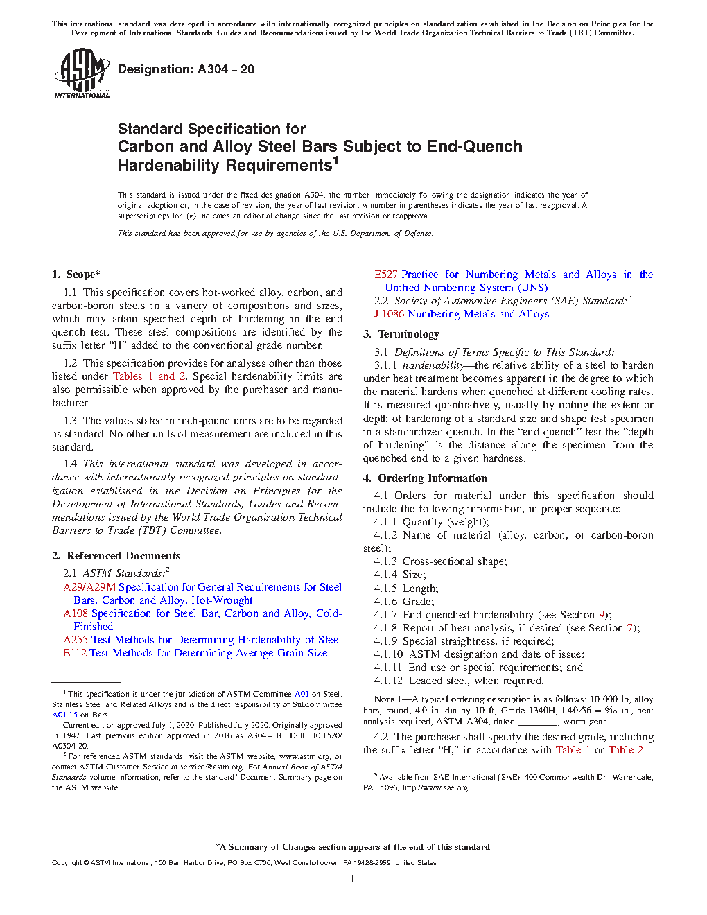 1.1 This specification covers hot-worked alloy, carbon, and carbon-boron steels in a variety of compositions and sizes, which may attain specified depth of hardening in the end quench test. These steel compositions are identified by the suffix letter “H” added to the conventional grade number.