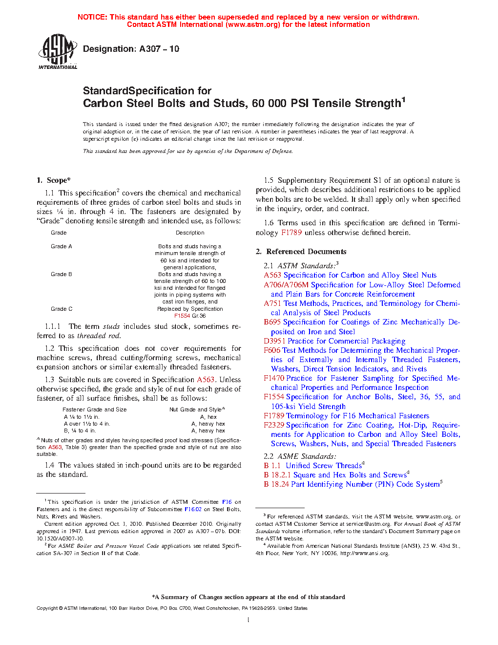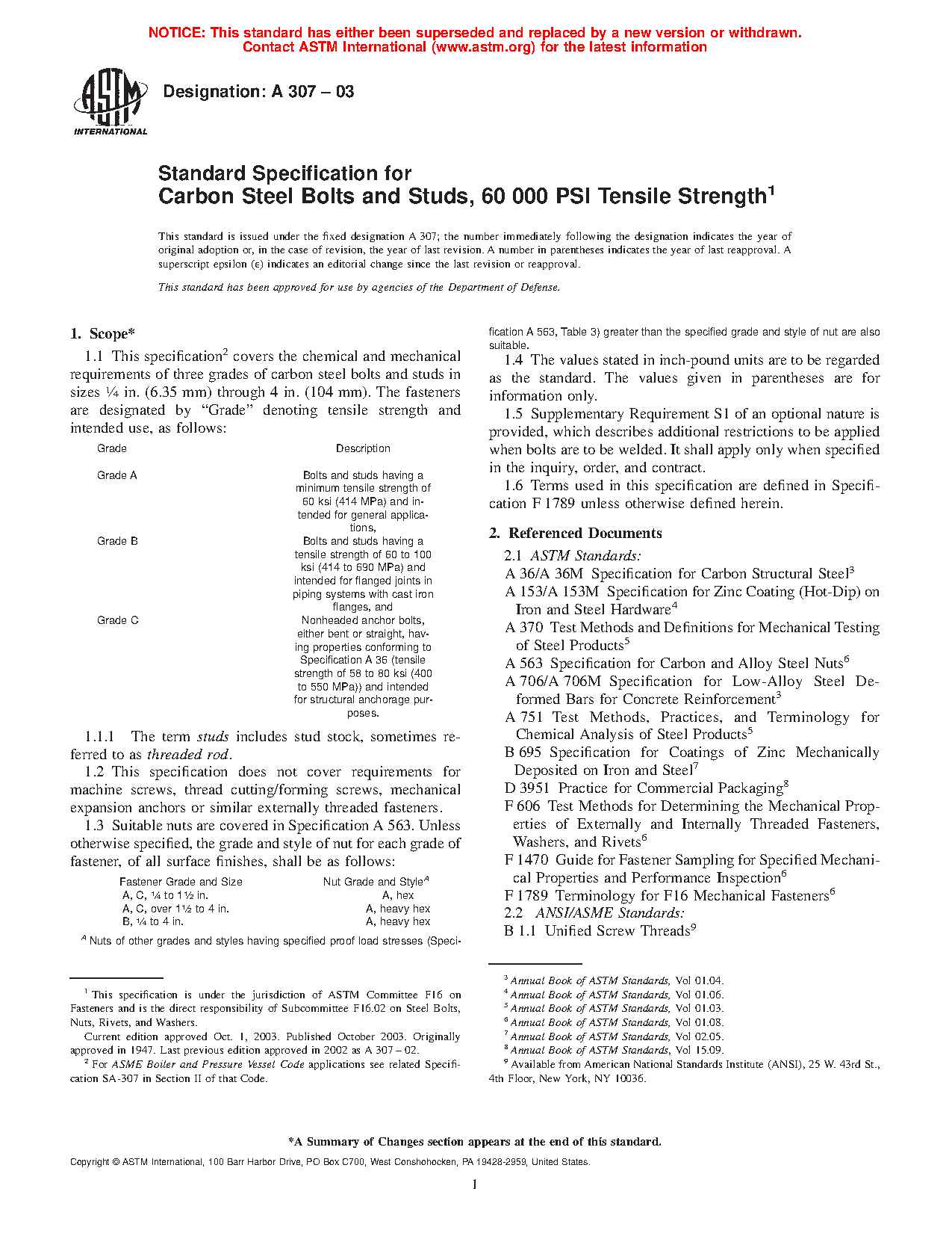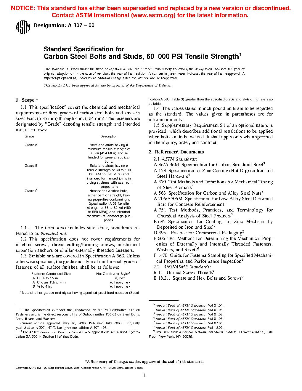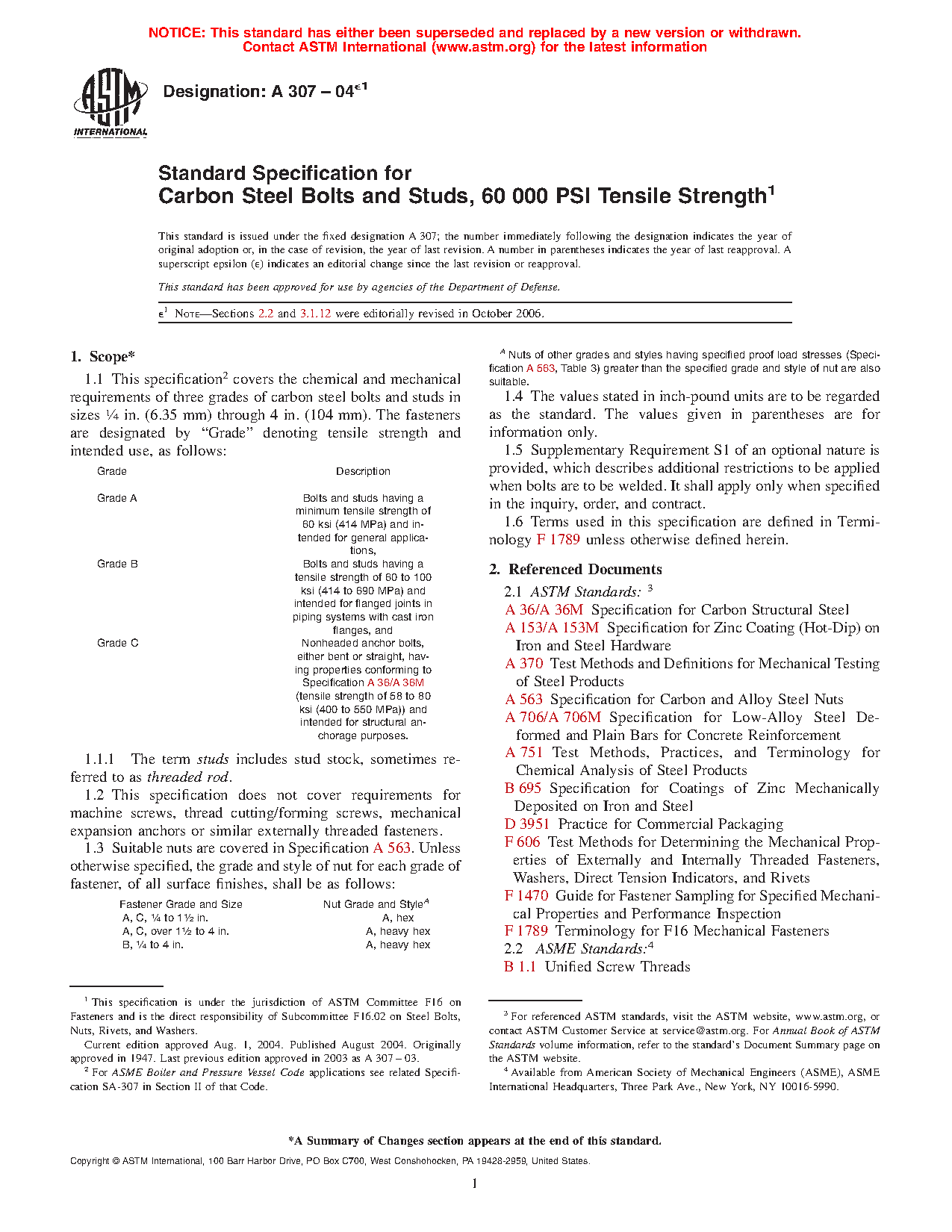 1.1 This specification2 covers the chemical and mechanical requirements of two grades of carbon steel bolts and studs in sizes 1/4 in. through 4 in. The fasteners are designated by “Grade” denoting tensile strength and intended use, as follows: