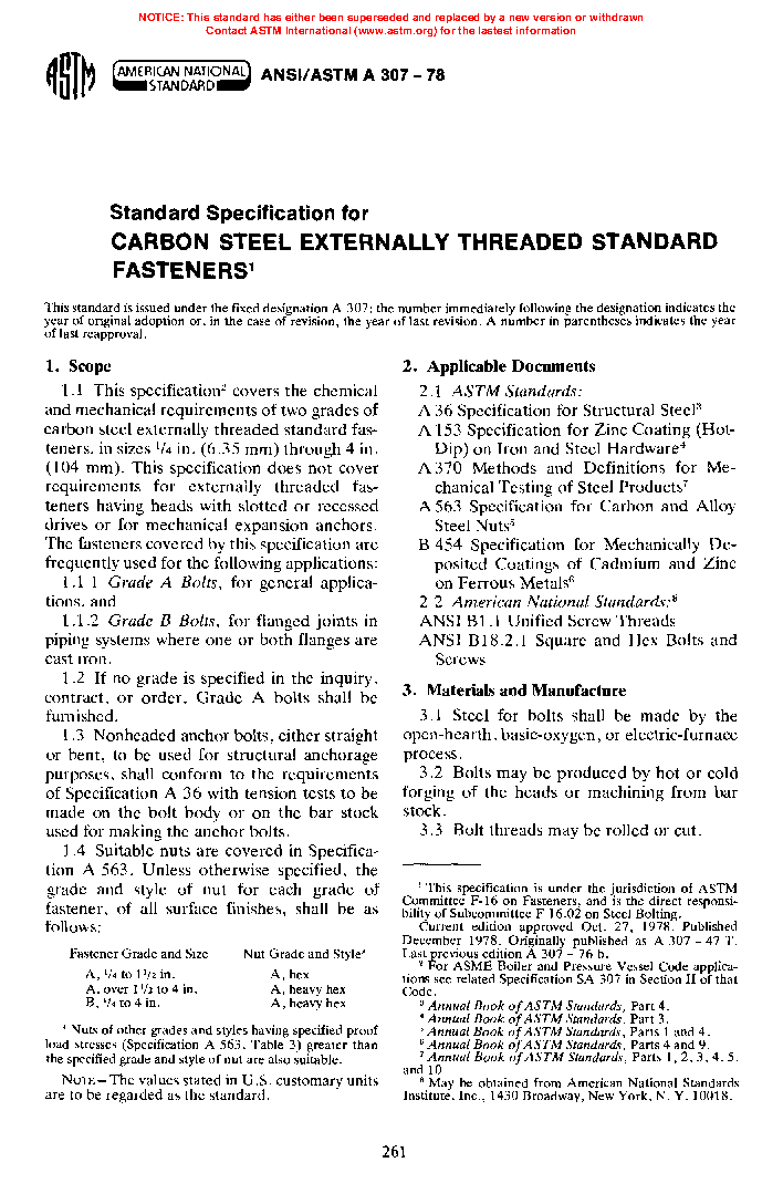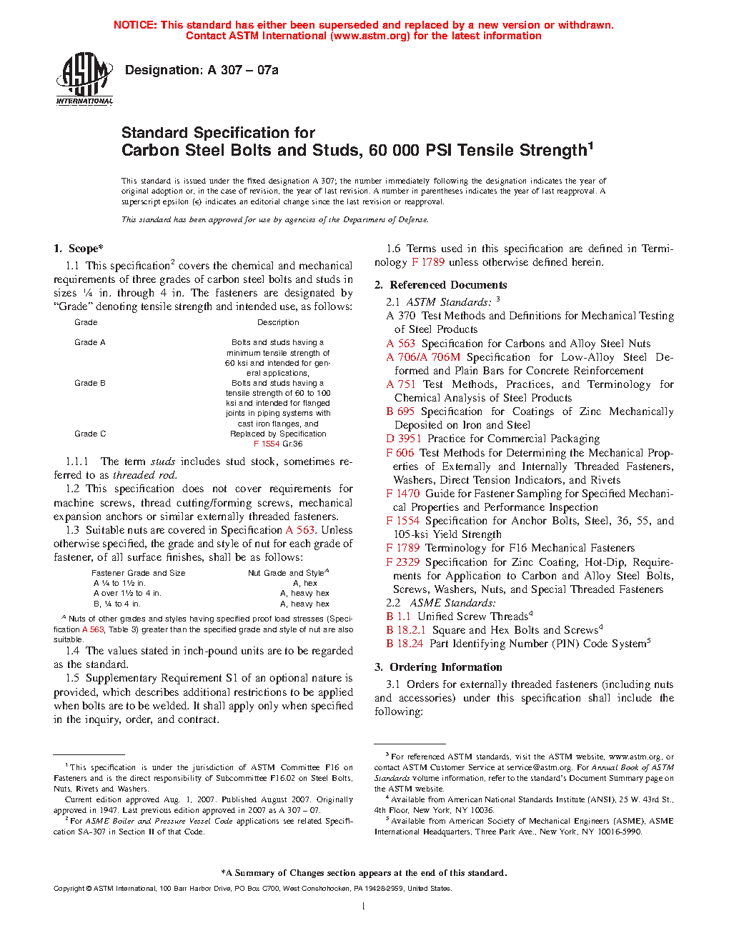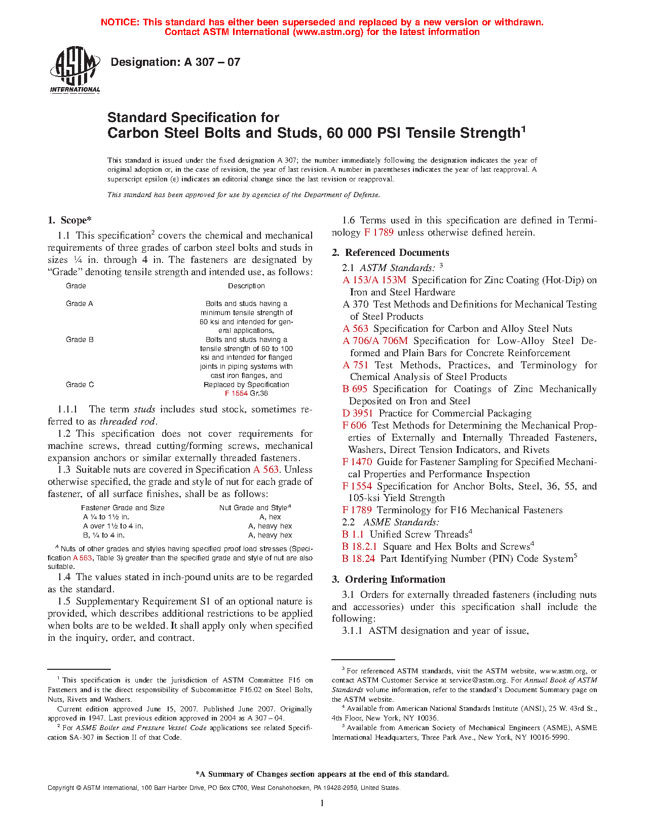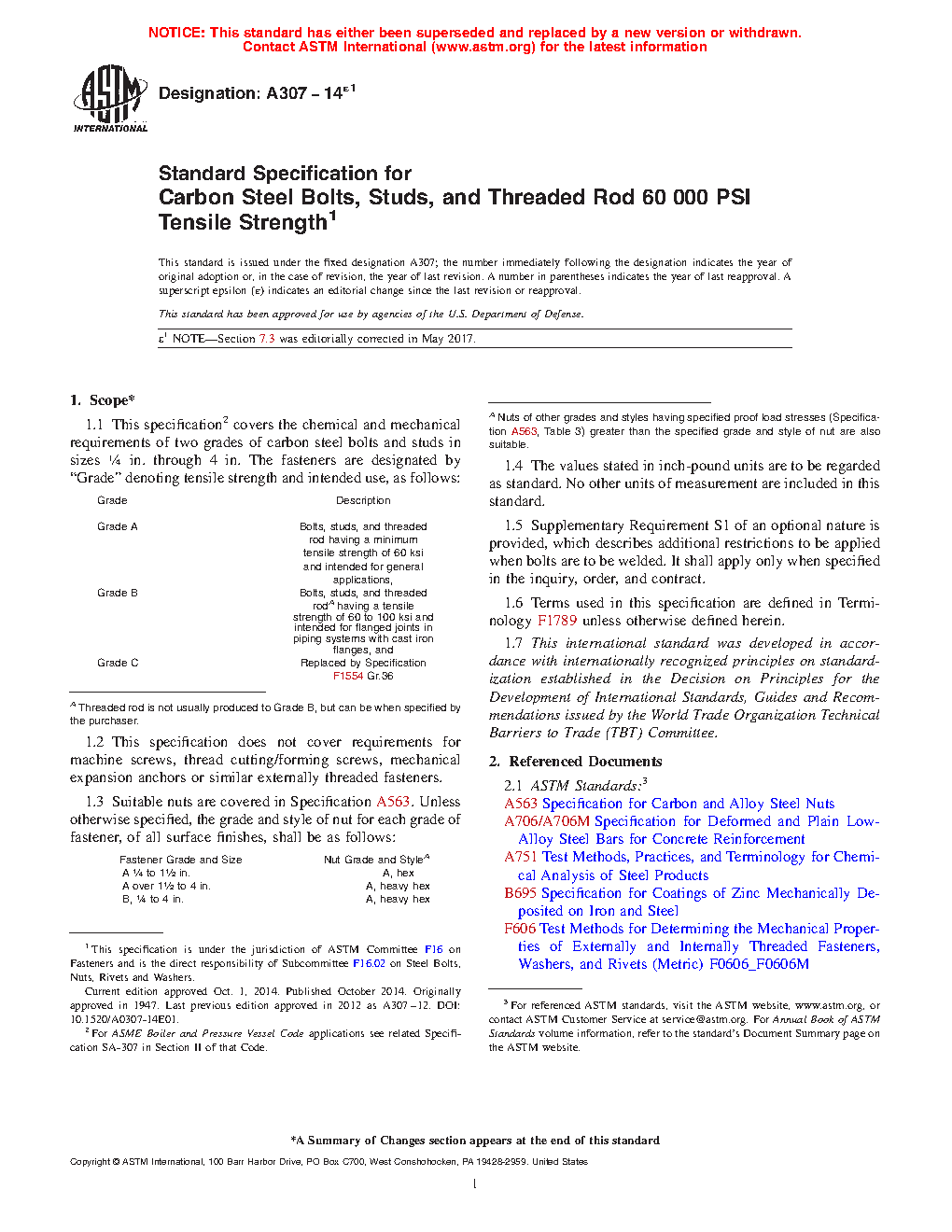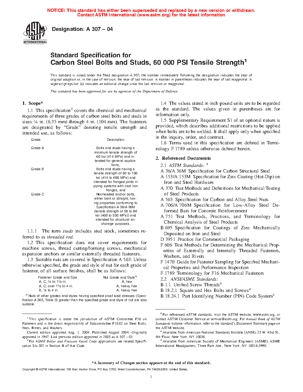 1.1 This specification2 covers the chemical and mechanical requirements of two grades of carbon steel bolts and studs in sizes 1/4 in. through 4 in. The fasteners are designated by “Grade” denoting tensile strength and intended use, as follows: