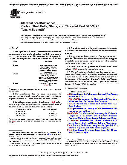 This specification covers the chemical and mechanical requirements for three grades (Grades A, B, and C) of carbon steel bolts and studs in specified sizes. This specification does not cover the requirements for machine screws, thread cutting/forming screws, mechanical expansion anchors, or other similar externally threaded fasteners. When tested, sampled specimens shall adhere to specified values for chemical composition, hardness, tensile strength, yield point, elongation, and dimensions.
