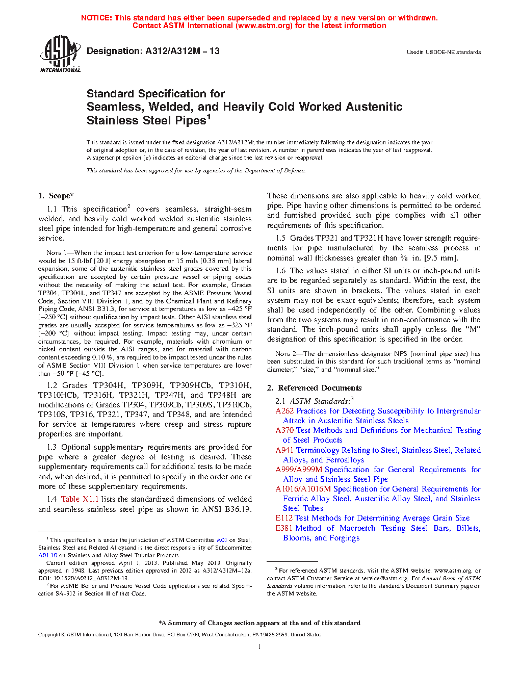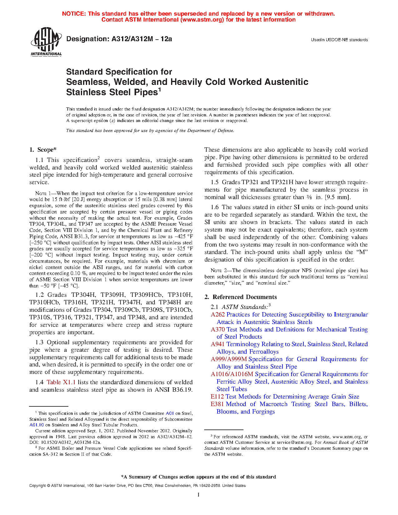 1.1 This specification2 covers seamless, straight-seam welded, and heavily cold worked welded austenitic stainless steel pipe intended for high-temperature and general corrosive service.