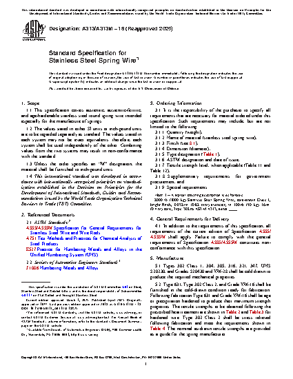 1.1 This specification covers austenitic, austenitic-ferritic, and age-hardenable stainless steel round spring wire intended especially for the manufacture of springs.