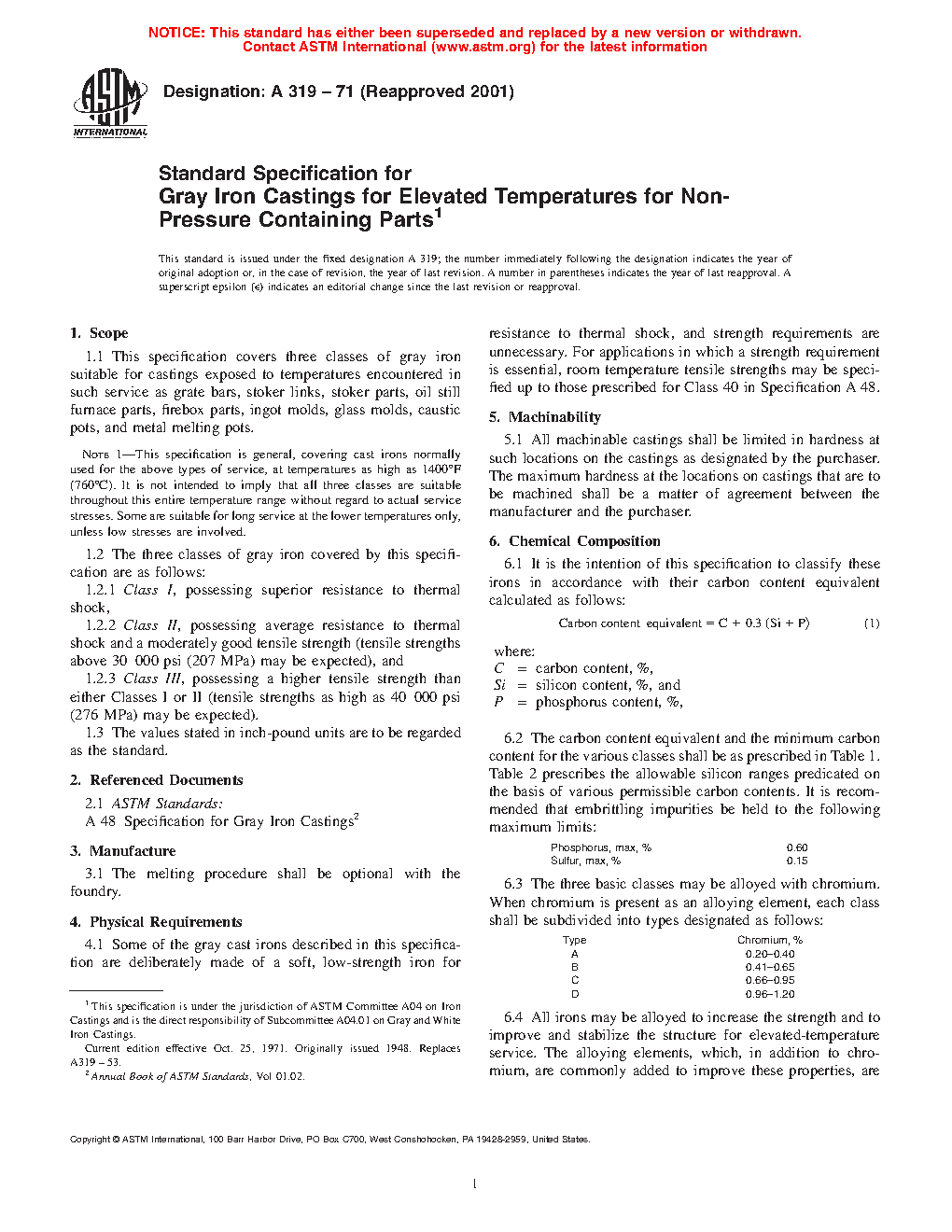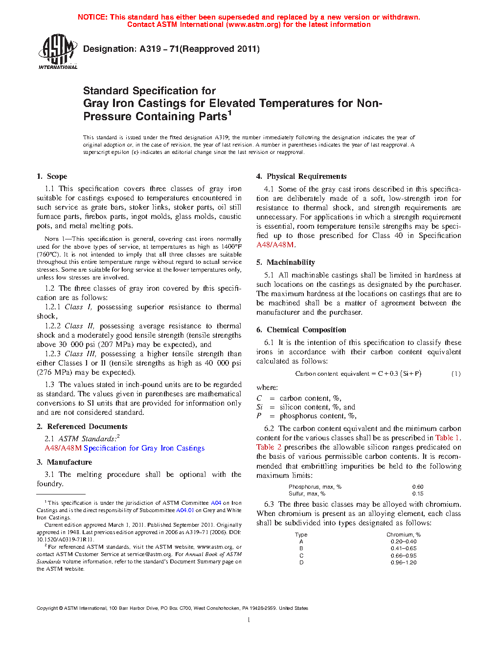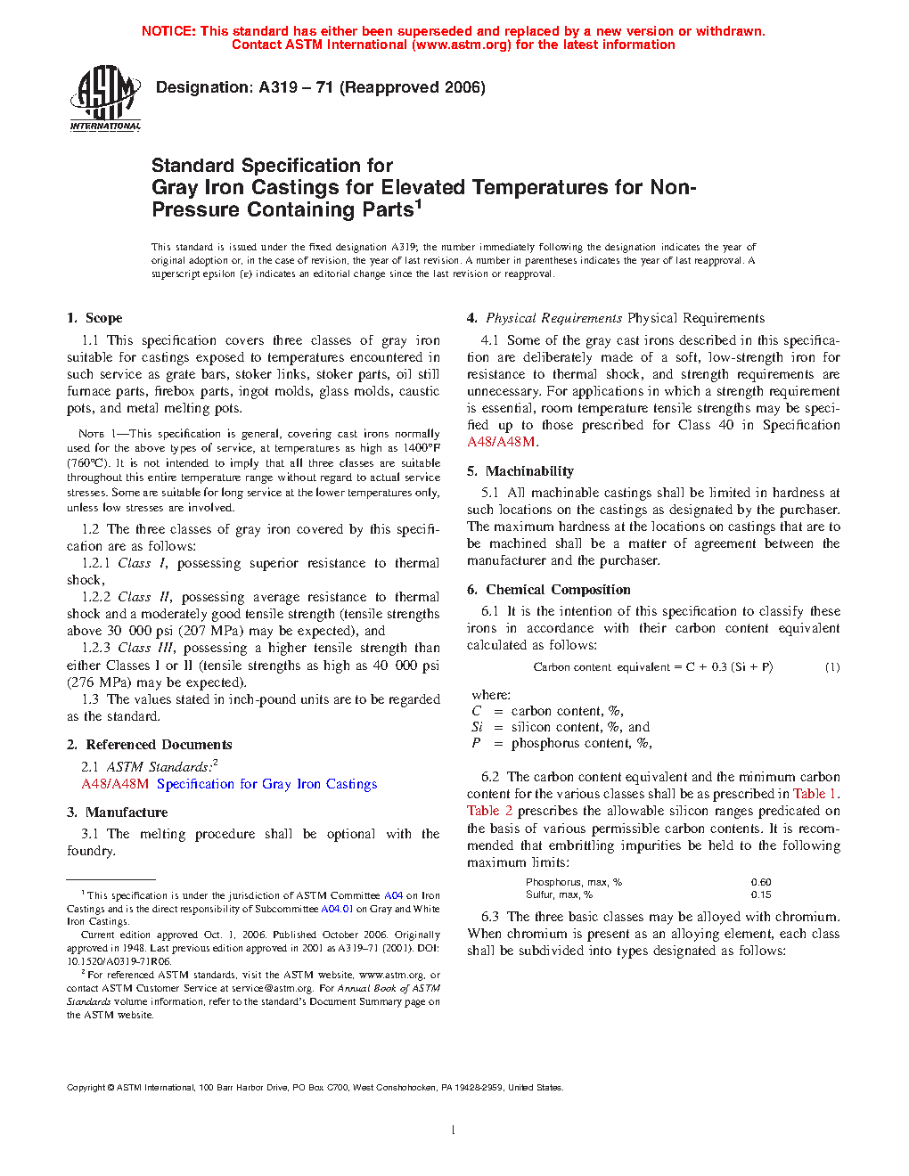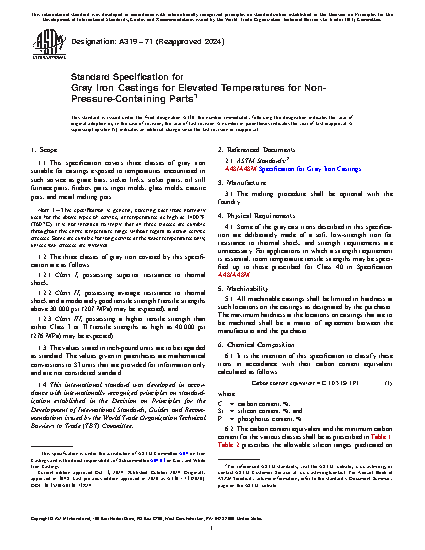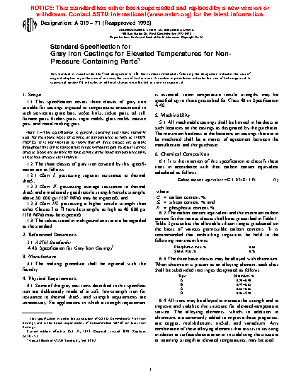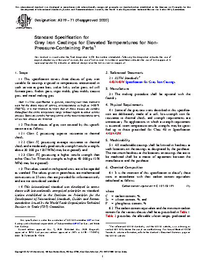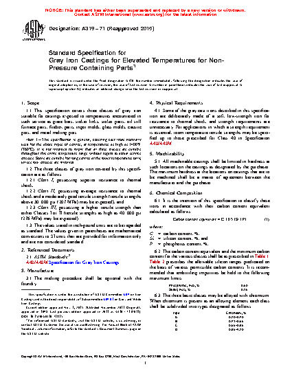Note 1--This specification is general, covering cast irons normally used for the above types of service, at temperatures as high as 1400oF (760oC). It is not intended to imply that all three classes are suitable throughout this entire temperature range without regard to actual service stresses. Some are suitable for long service at the lower temperatures only, unless low stresses are involved.