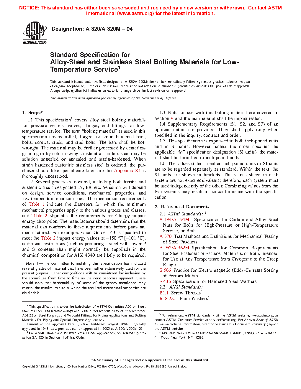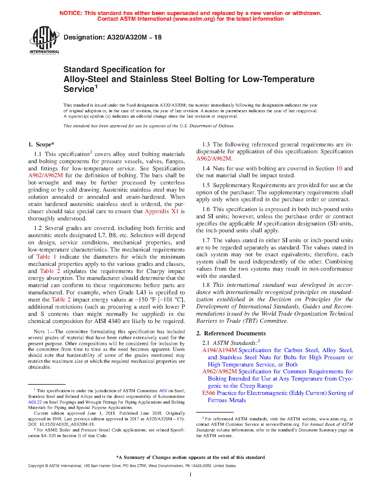 1.1 This specification covers alloy steel bolting materials for pressure vessels, valves, flanges, and fittings for low-temperature service. The term "bolting material" as used in this specification covers rolled, forged, or strain hardened bars, bolts, screws, studs, and stud bolts. The bars shall be hot-wrought. The material may be further processed by centerless grinding or by cold drawing. Austenitic stainless steel may be solution annealed or annealed and strain-hardened. When strain hardened austenitic stainless steel is ordered, the purchaser should take special care to ensure that Appendix X1 is thoroughly understood.