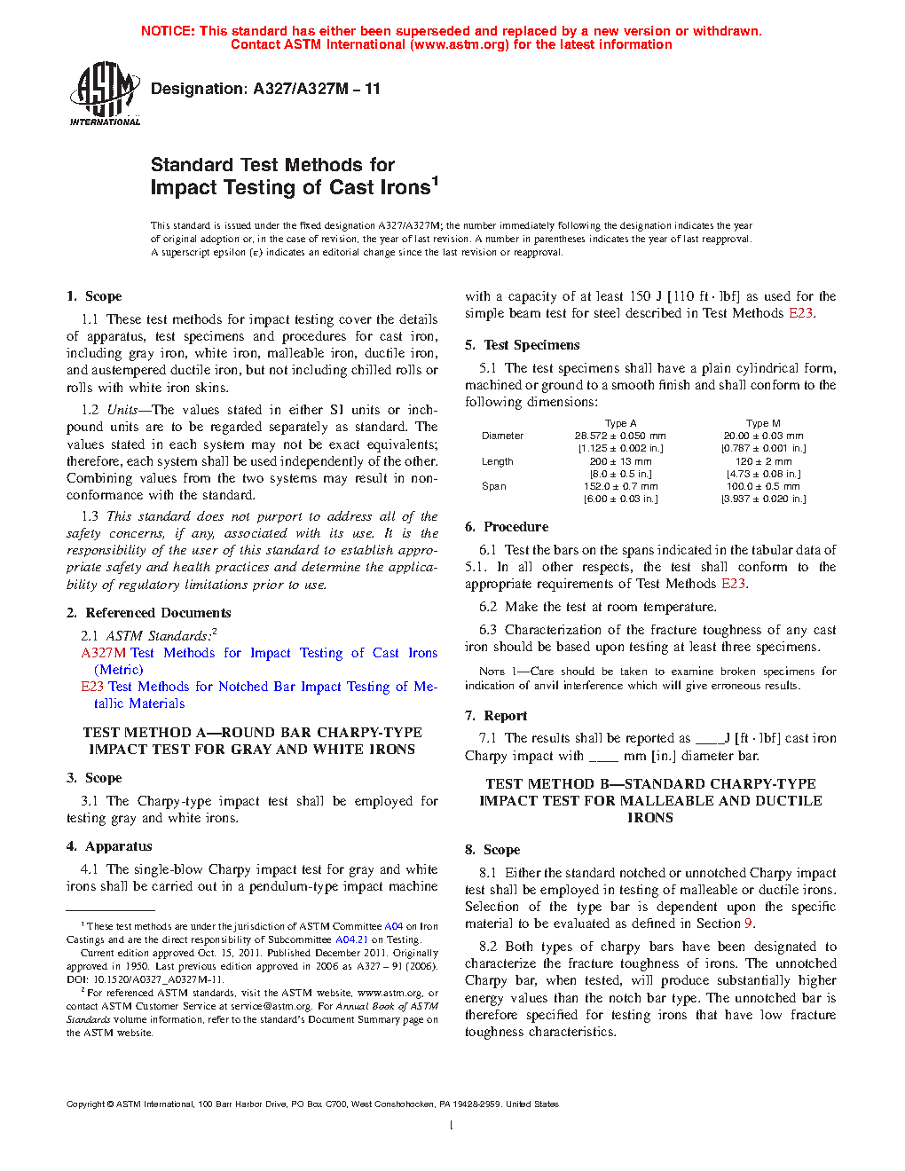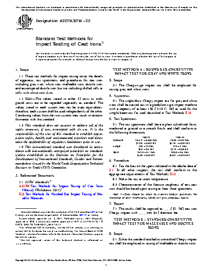 1.1 These test methods for impact testing cover the details of apparatus, test specimens, and procedures for cast iron, including gray iron, white iron, malleable iron, ductile iron, and austempered ductile iron, but not including chilled rolls or rolls with white iron skins.