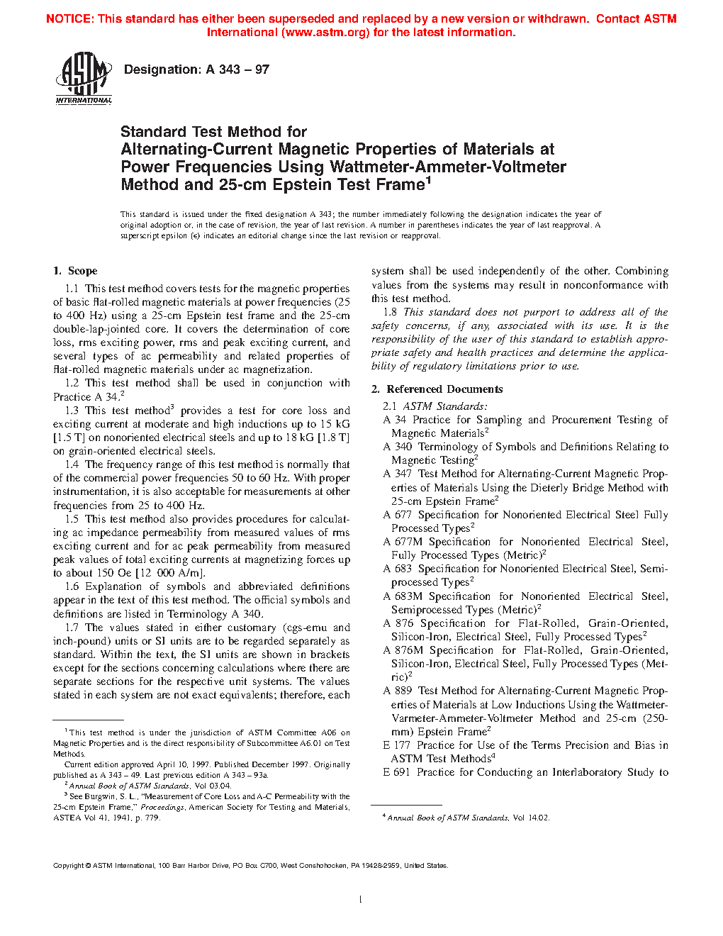 1.3 This test method provides a test for core loss and exciting current at moderate and high magnetic flux densities up to 15 kG [1.5 T] on nonoriented electrical steels and up to 18 kG [1.8 T] on grain-oriented electrical steels.