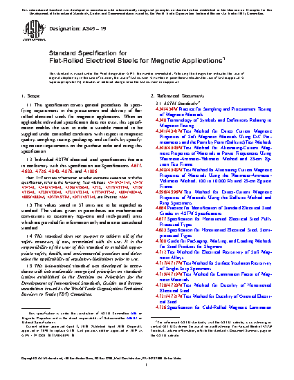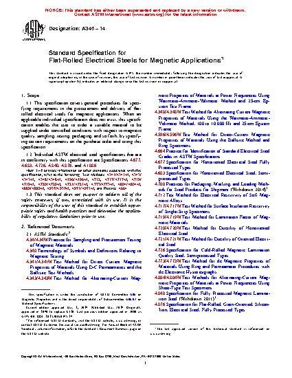 This specification concerns general procedures for specifying requirements of flat-rolled electrical steels for magnetic applications. This specification is to be used when the material in question is not covered by an ASTM material specification. The specification does not contain requirements but instead lists physical properties, ordering information and other attributes that should be considered when purchasing the material. All ASTM electrical steel specifications are in conformity to this specification.