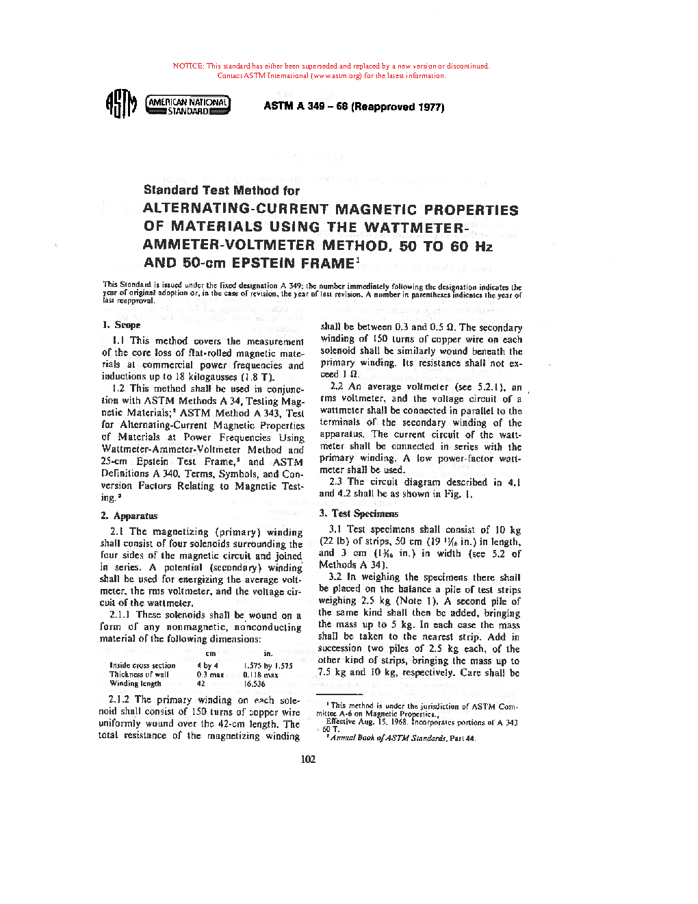 Test Methods for Alternating-Current Magnetic Properties of Materials Using the Wattmeter-Ammeter-Voltmeter Method, 50 to 60 Hz and 50 cm Epstein Frame