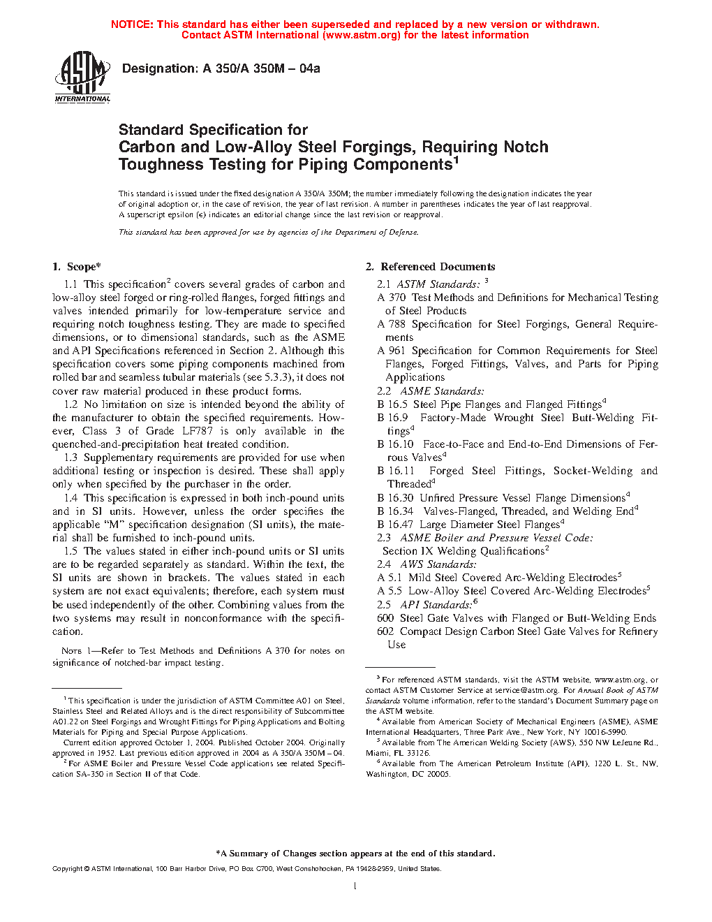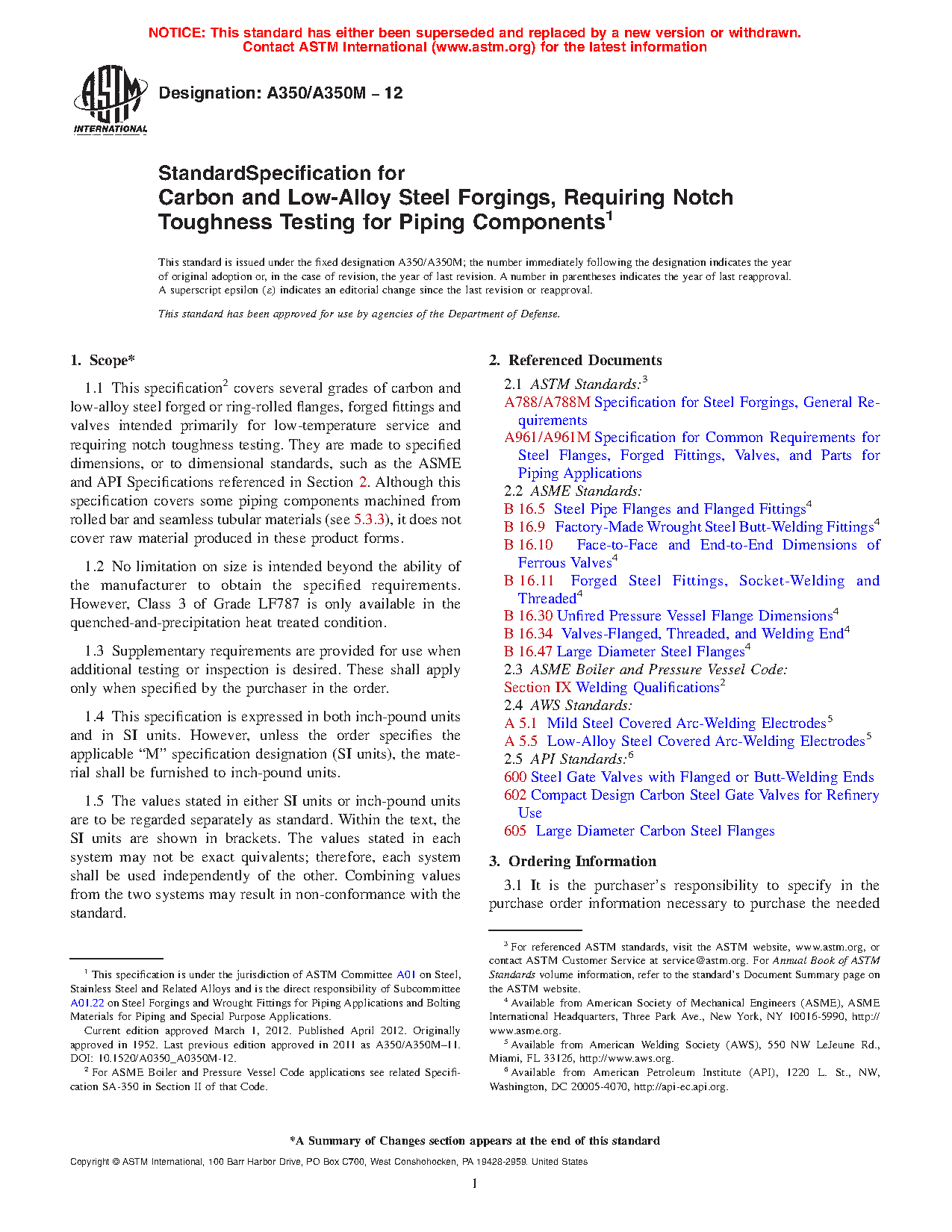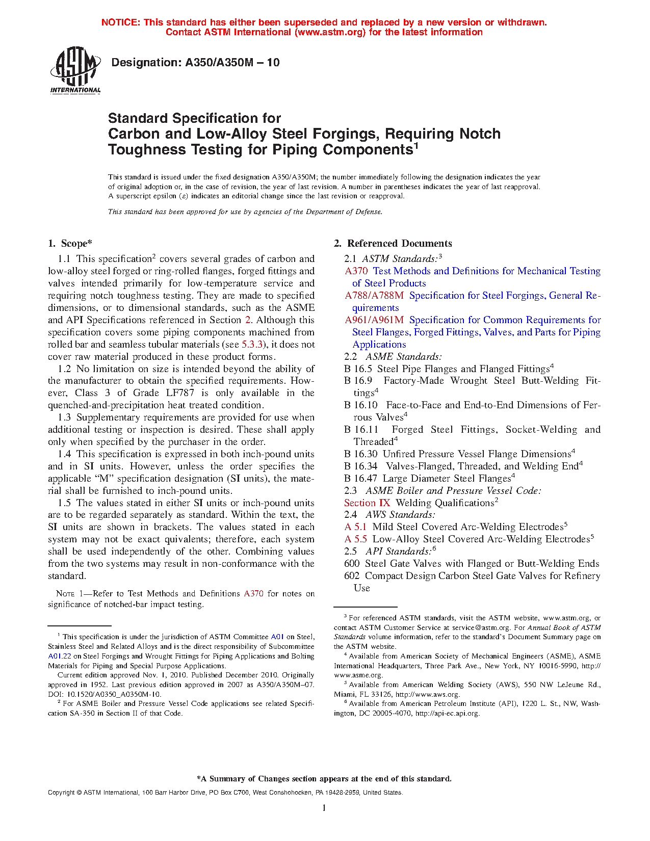 1.1 This specification covers several grades of carbon and low-alloy steel forged or ring-rolled flanges, forged fittings and valves intended primarily for low-temperature service and requiring notch toughness testing. They are made to specified dimensions, or to dimensional standards, such as the ASME and API Specifications referenced in Section . Although this specification covers some piping components machined from rolled bar and seamless tubular materials (see ), it does not cover raw material produced in these product forms.