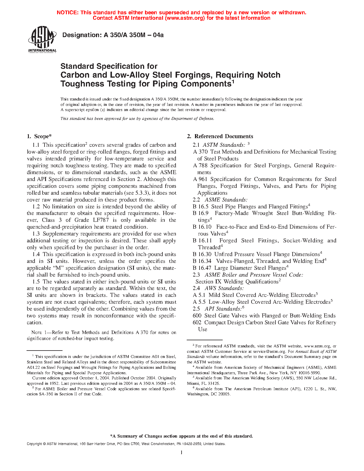 1.1 This specification2 covers several grades of carbon and low-alloy steel forged or ring-rolled flanges, forged fittings and valves intended primarily for low-temperature service and requiring notch toughness testing. They are made to specified dimensions, or to dimensional standards, such as the ASME and API Specifications referenced in Section 2. Although this specification covers some piping components machined from rolled bar and seamless tubular materials (see 5.3.3), it does not cover raw material produced in these product forms.