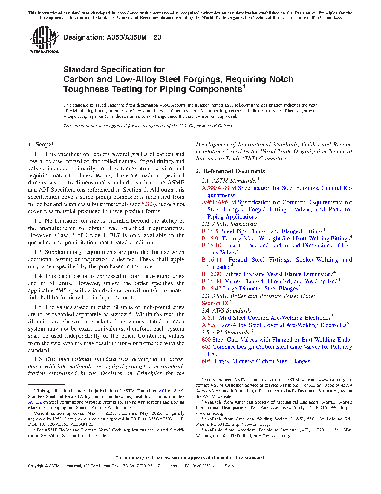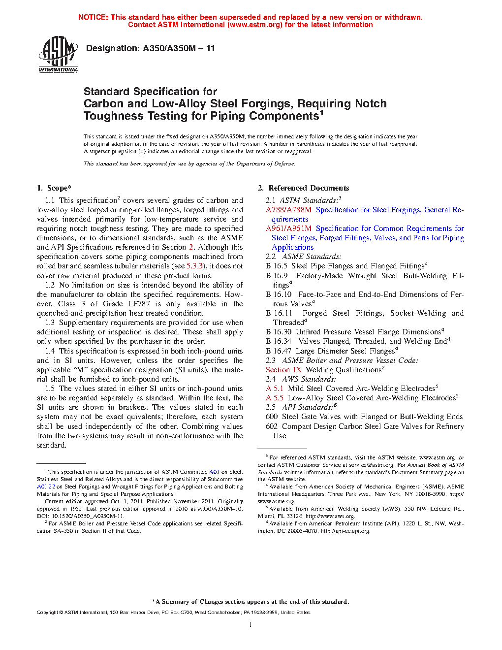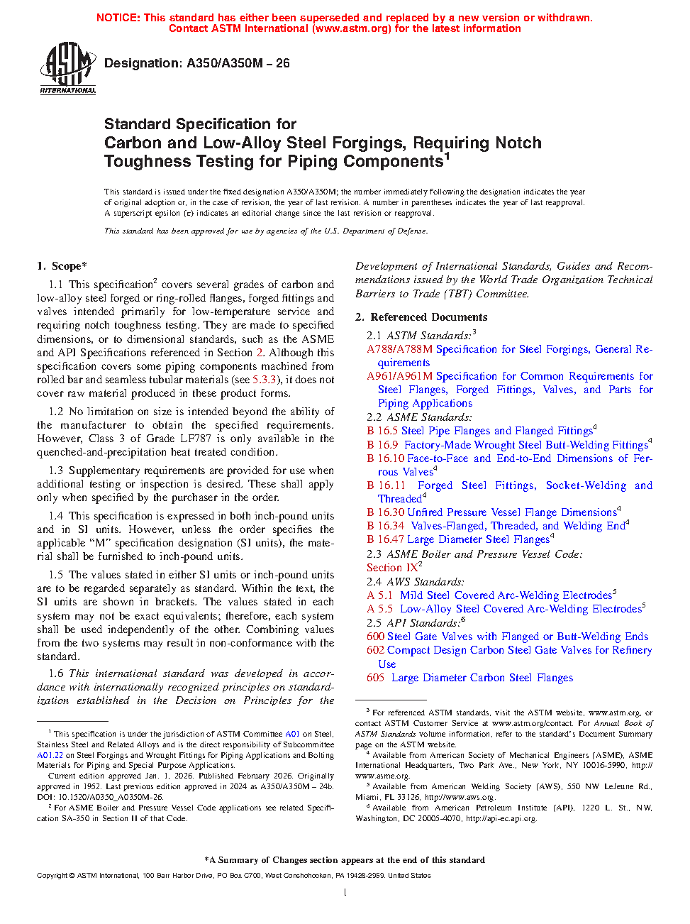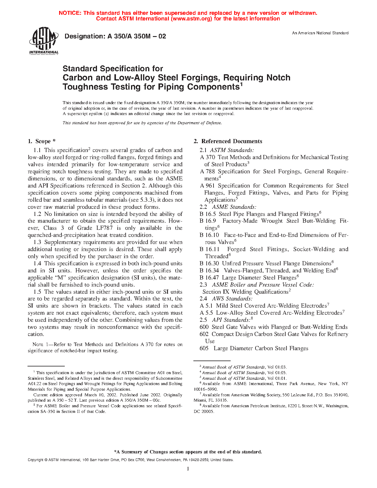 1.1 This specification2 covers several grades of carbon and low-alloy steel forged or ring-rolled flanges, forged fittings and valves intended primarily for low-temperature service and requiring notch toughness testing. They are made to specified dimensions, or to dimensional standards, such as the ASME and API Specifications referenced in Section 2. Although this specification covers some piping components machined from rolled bar and seamless tubular materials (see 5.3.3), it does not cover raw material produced in these product forms.