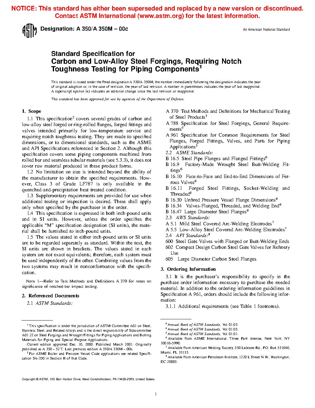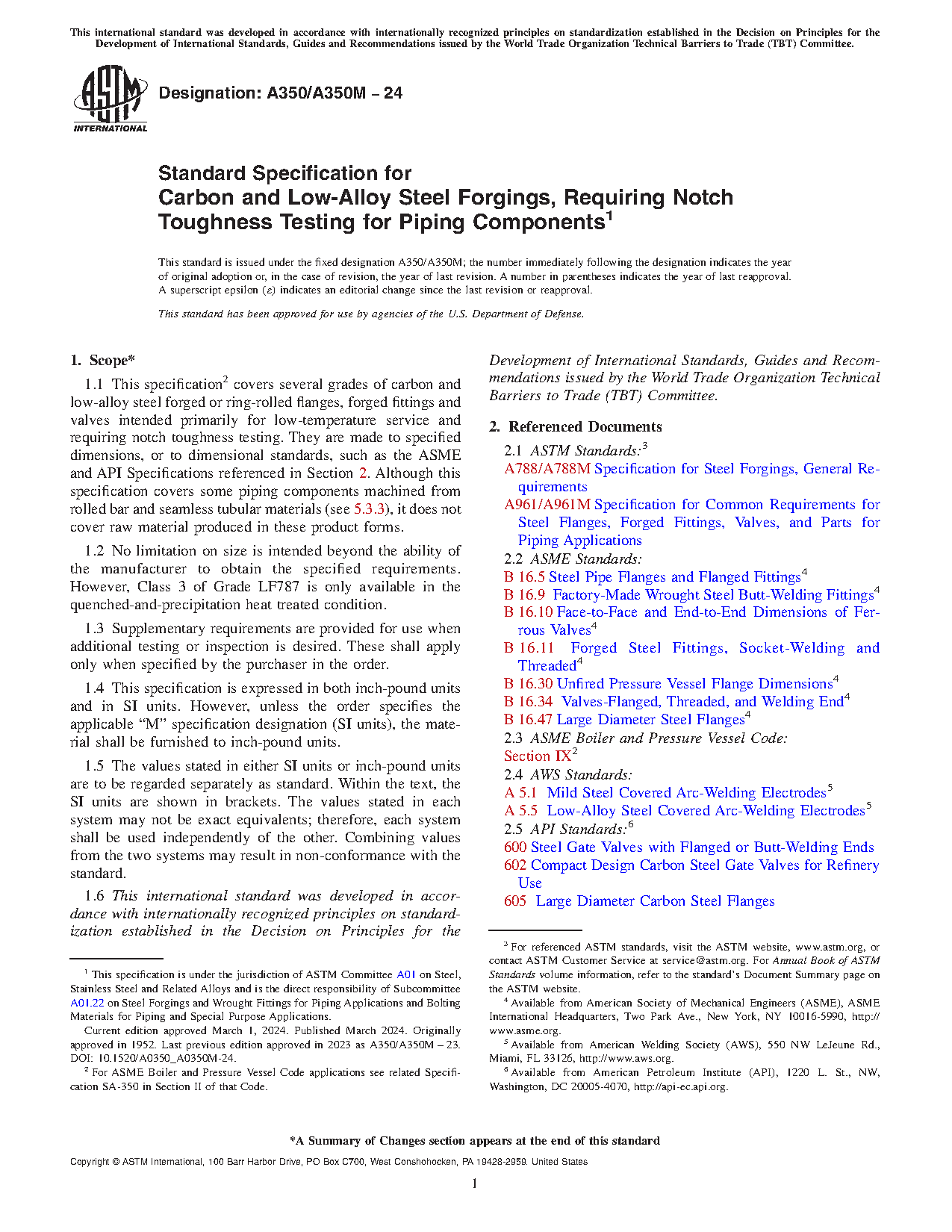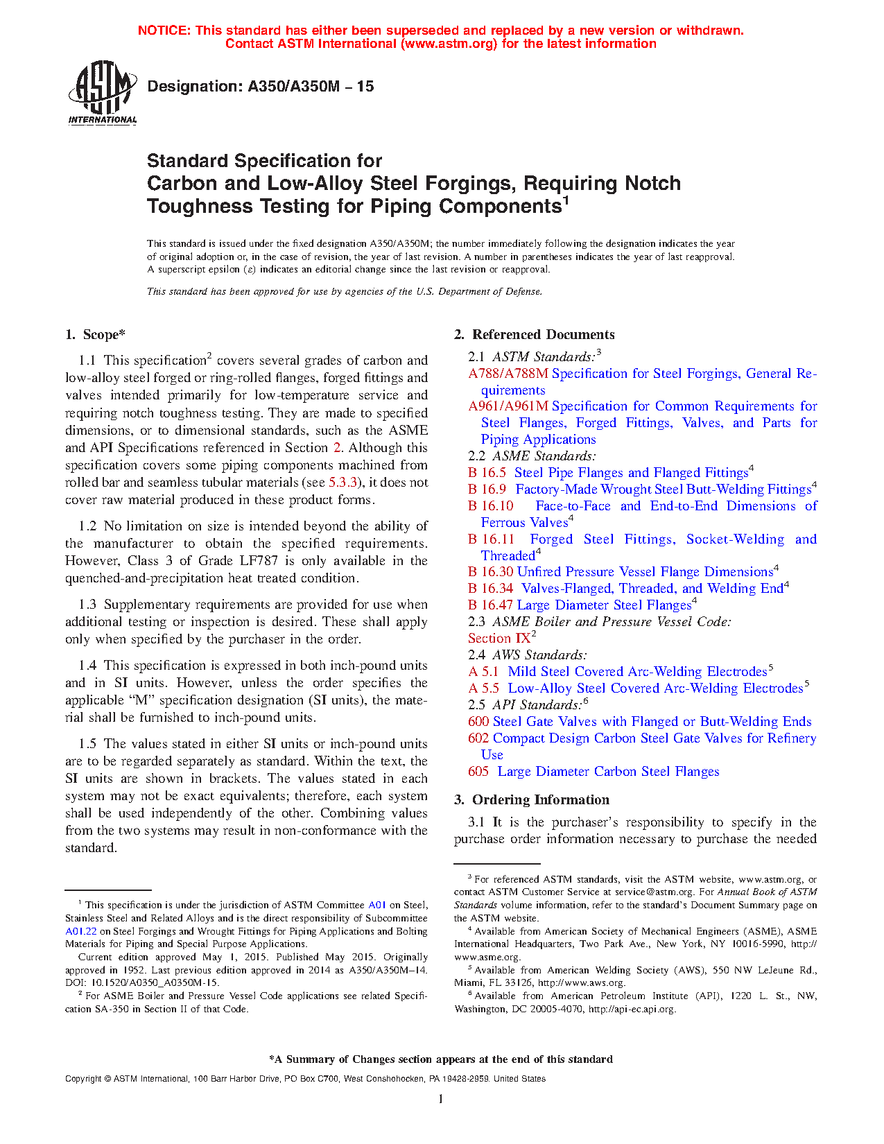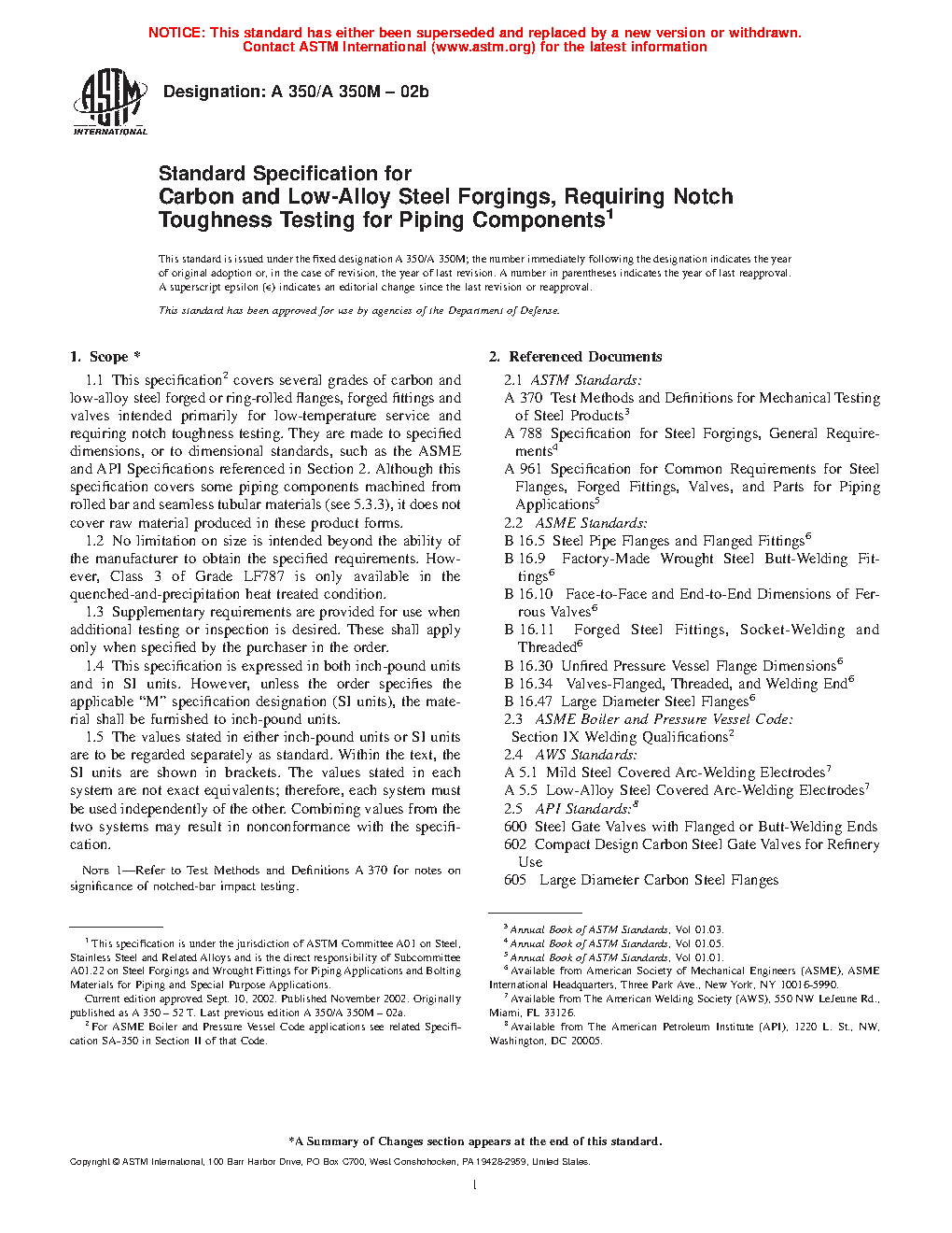 1.1 This specification2 covers several grades of carbon and low-alloy steel forged or ring-rolled flanges, forged fittings and valves intended primarily for low-temperature service and requiring notch toughness testing. They are made to specified dimensions, or to dimensional standards, such as the ASME and API Specifications referenced in Section 2. Although this specification covers some piping components machined from rolled bar and seamless tubular materials (see 5.3.3), it does not cover raw material produced in these product forms.