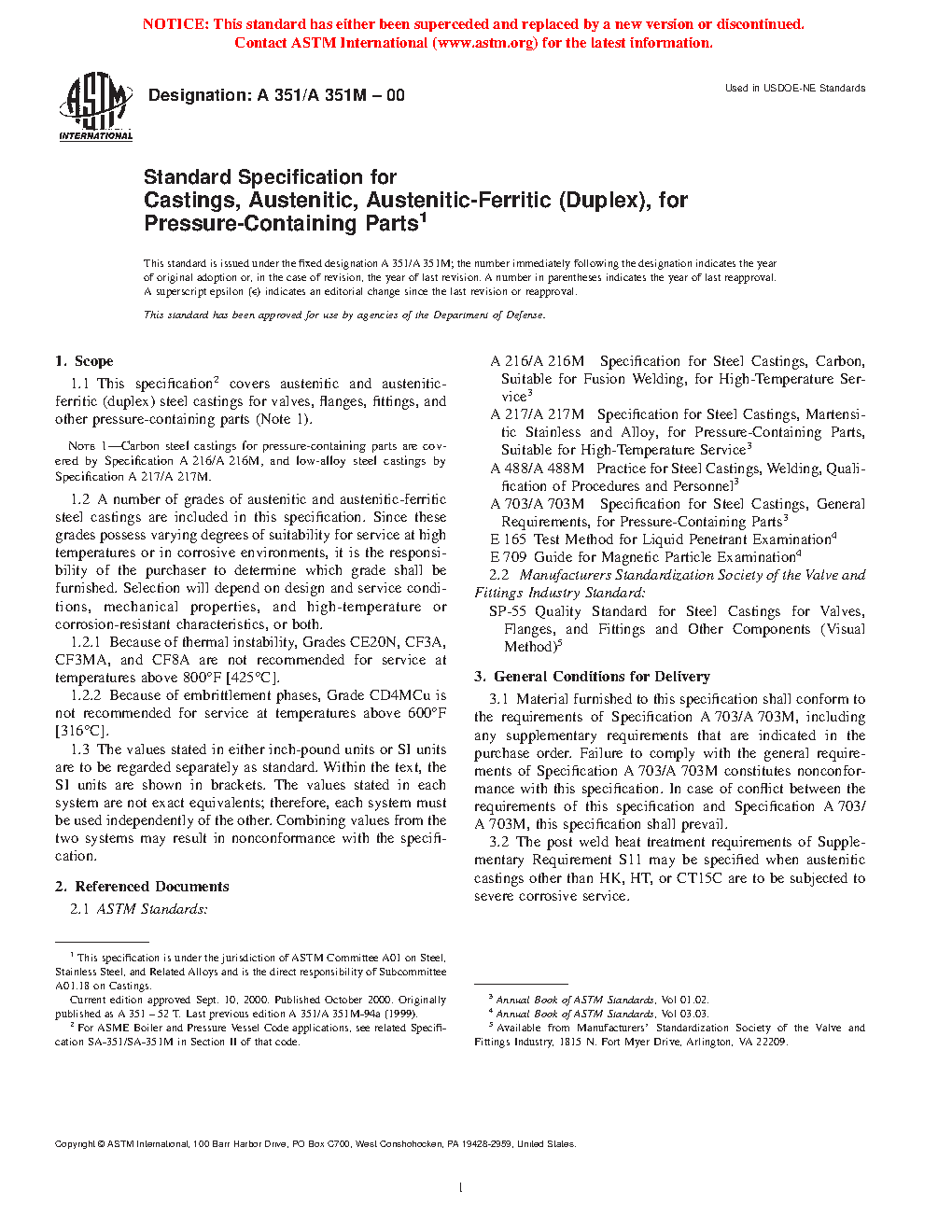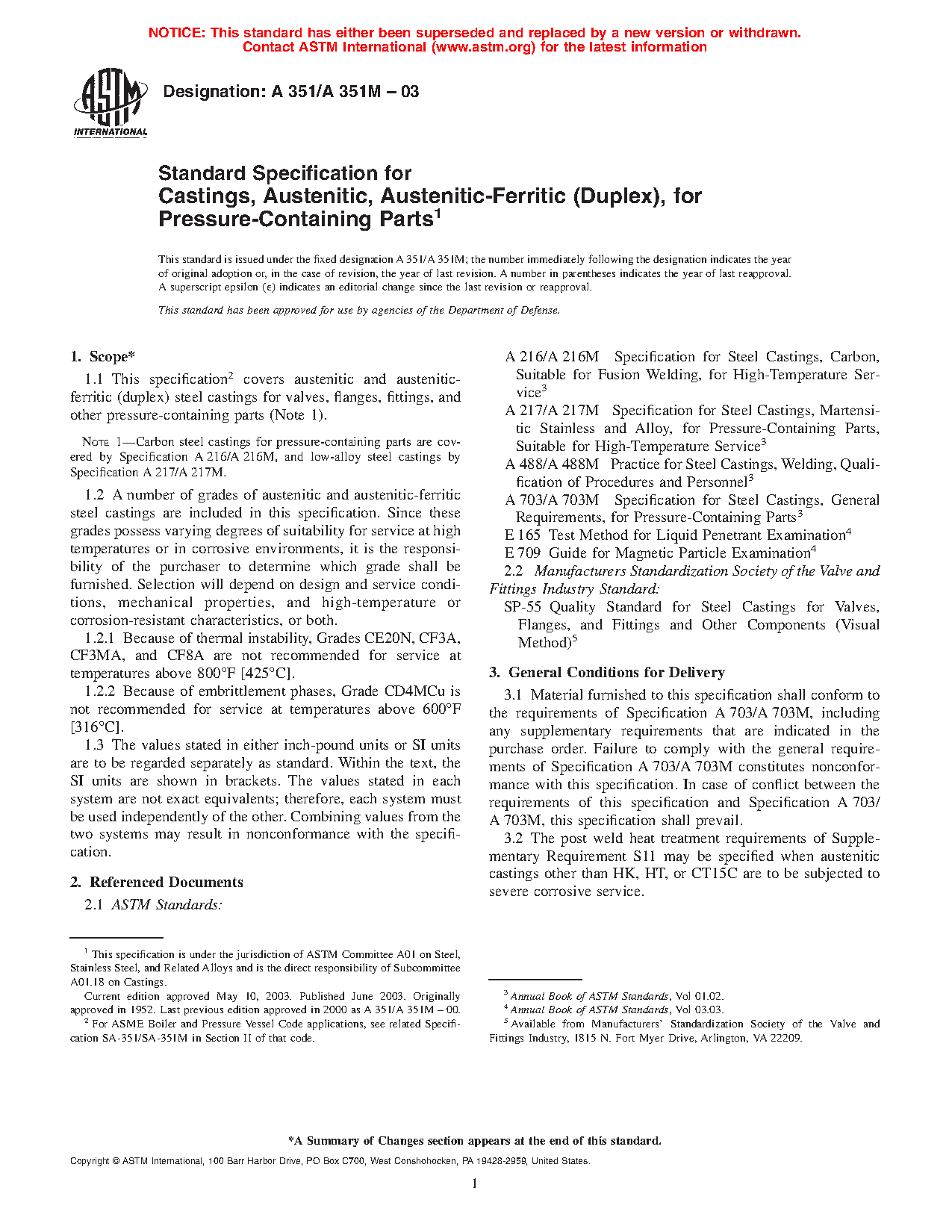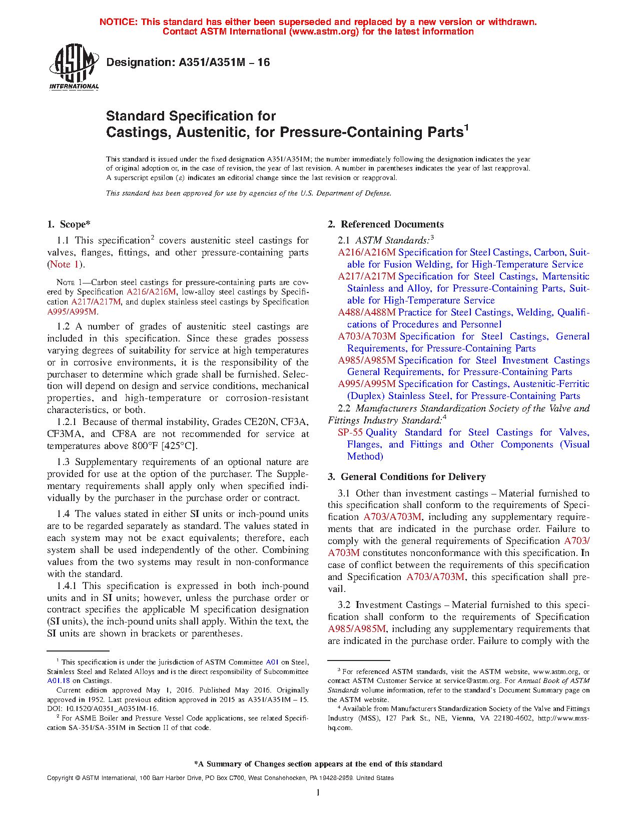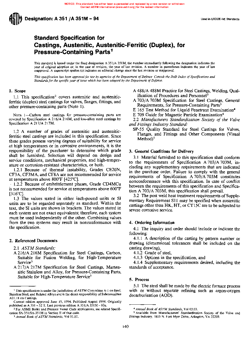 Note 1—Carbon steel castings for pressure-containing parts are covered by Specification A216/A216M, low-alloy steel castings by Specification A217/A217M, and duplex stainless steel castings by Specification A995/A995M.