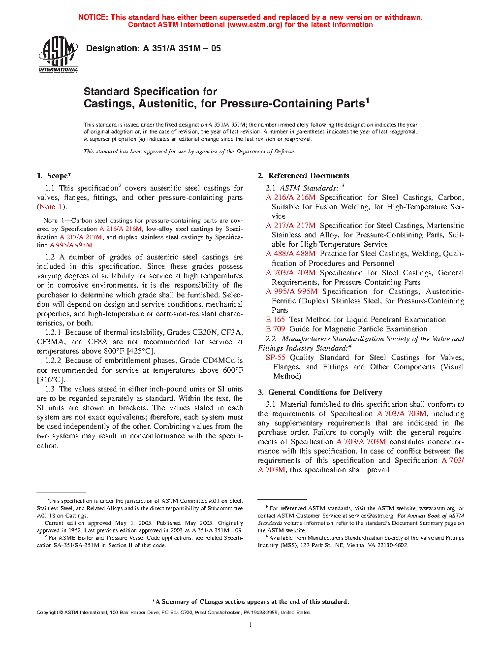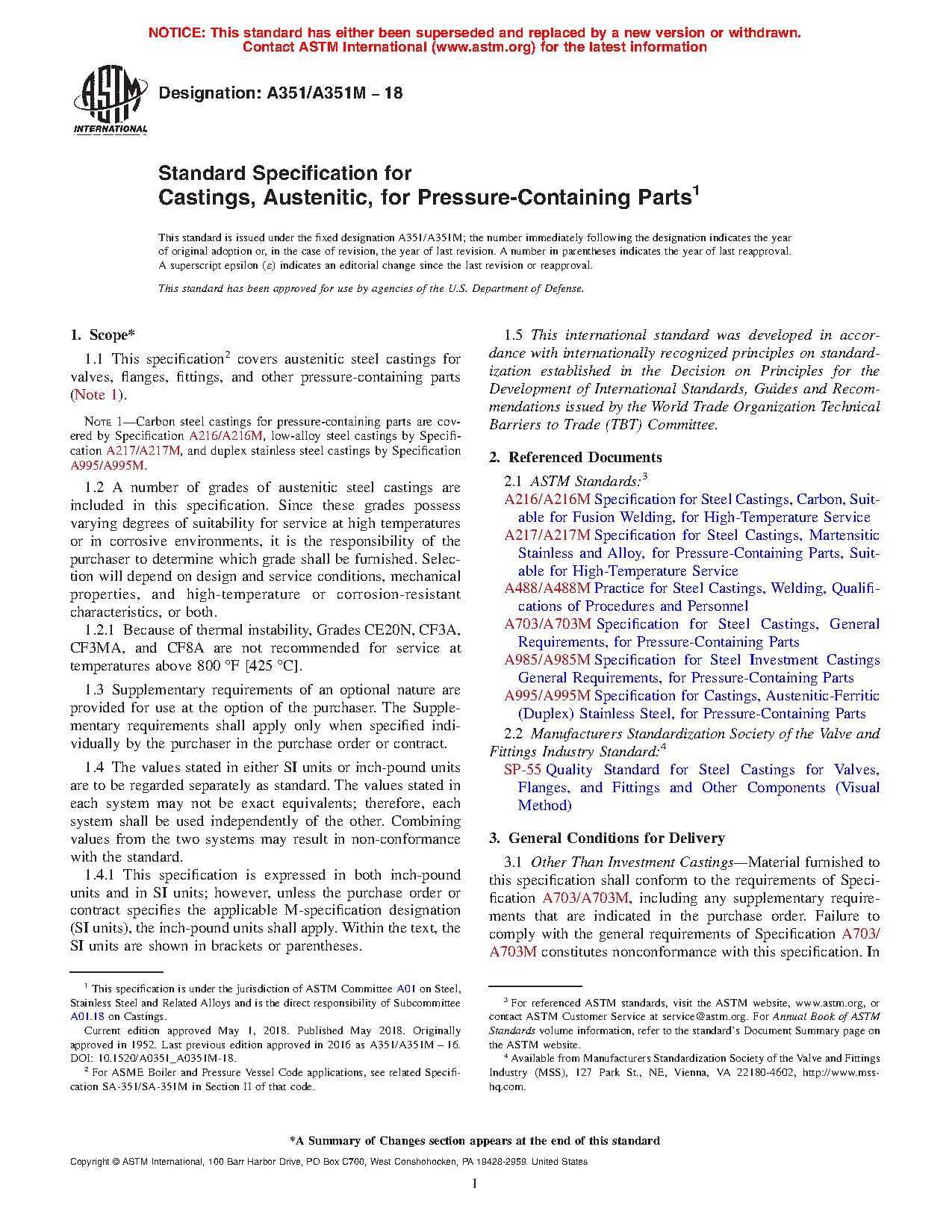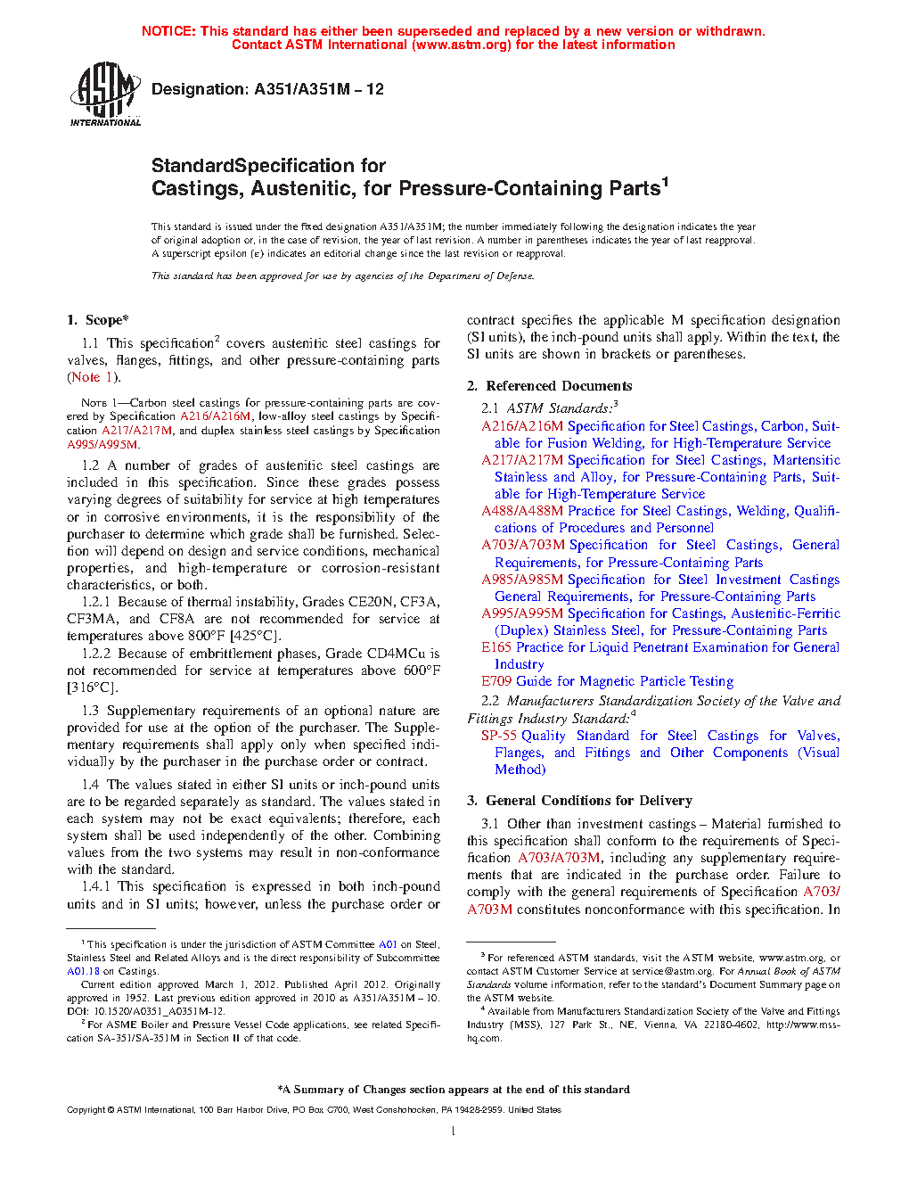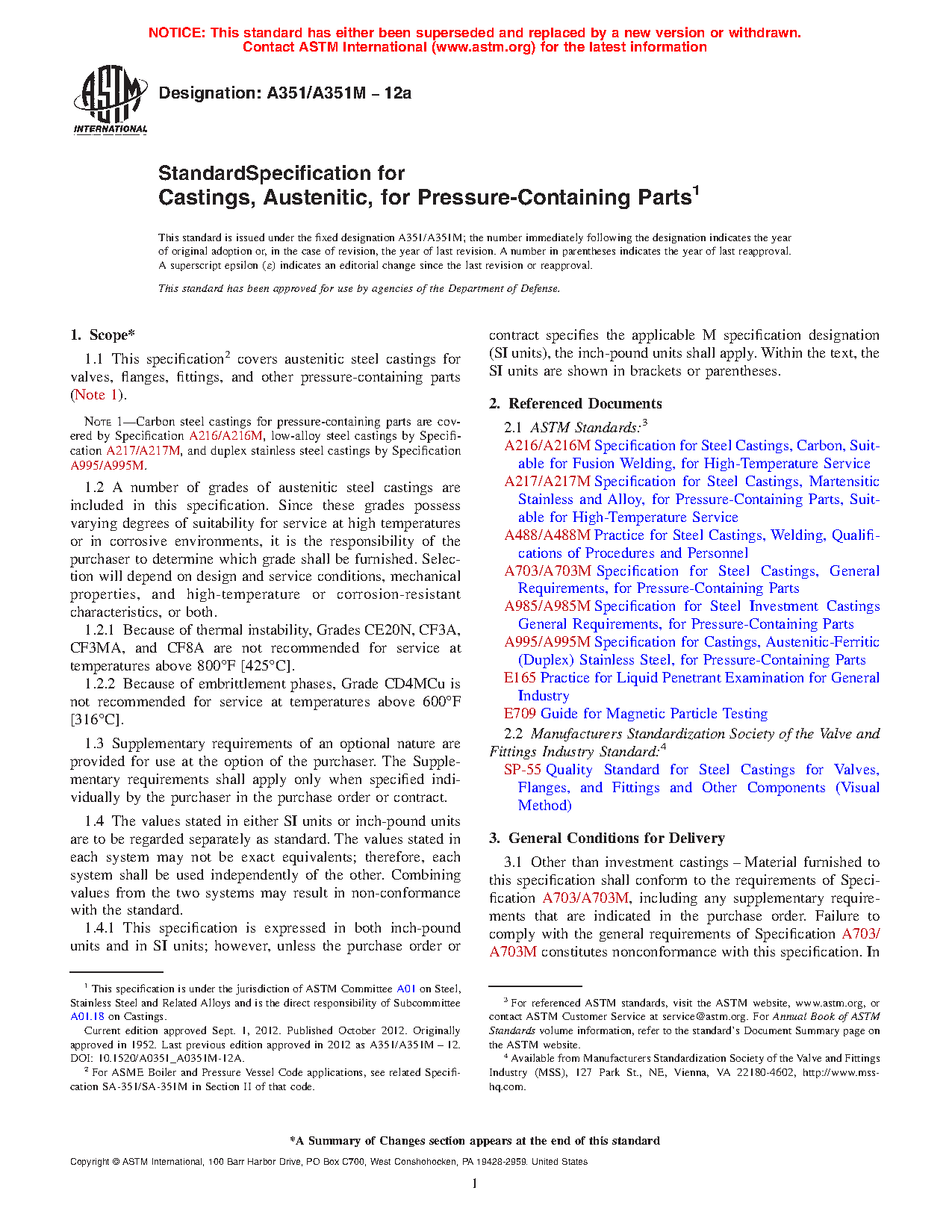 Note 1—Carbon steel castings for pressure-containing parts are covered by Specification A216/A216M, low-alloy steel castings by Specification A217/A217M, and duplex stainless steel castings by Specification A995/A995M.