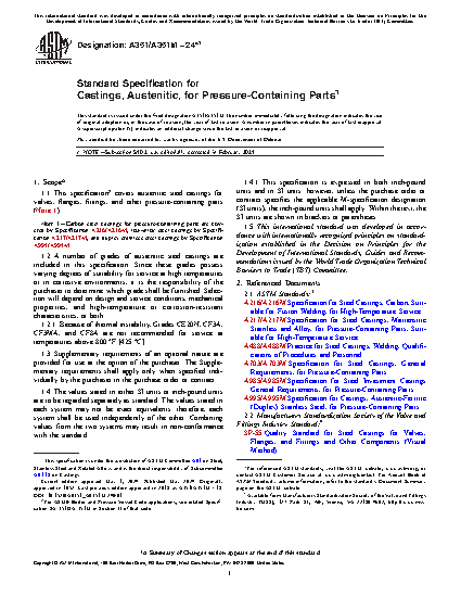 1.1 This specification covers austenitic steel castings for valves, flanges, fittings, and other pressure-containing parts (Note 1).