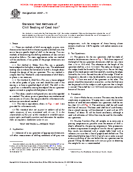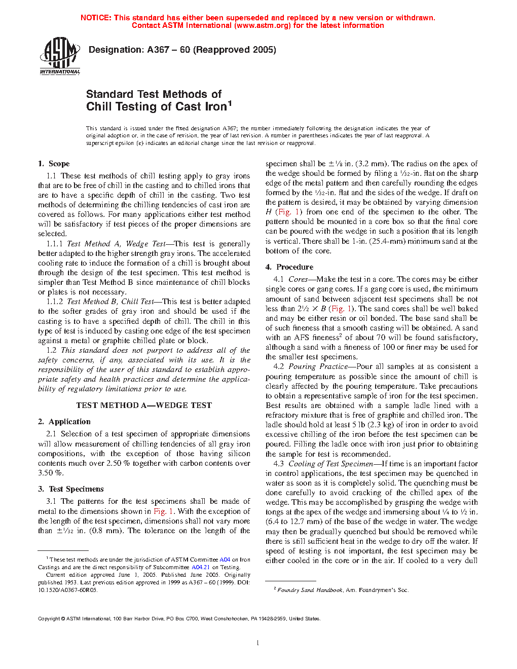1.1.1 Test Method A, Wedge Test—This test is adapted for the higher-strength gray irons. The accelerated cooling rate to induce the formation of a chill is brought about through the design of the test specimen. This test method is simpler than Test Method B since maintenance of chill blocks or plates is not necessary.