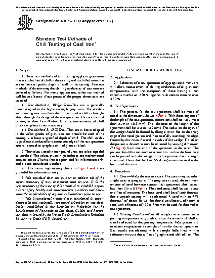 This test method deals with gray irons that are to be free of chill in the casting and to chilled irons that are to have a specific depth of chill in the casting. The purpose of the test is to determine the chilling tendencies of cast iron. The two tests are wedge test and chill test. Both tests shall be made in a core which may either be single cores or gang cores and a pouring practice shall be performed. The wedge test is generally better adapted to the higher strength gray irons. The accelerated cooling rate that shall induce the formation of a chill shall be brought about through the design of the test specimen. The chill test is better adapted to the softer grades of gray iron and should be used if the casting have a specified depth of chill. The chill in this type of test shall be induced by casting one edge of the test specimen against a metal or graphite chilled plate or block. Wedge test is simpler than chill test since in the wedge test, maintenance of chill blocks or plates is not necessary.