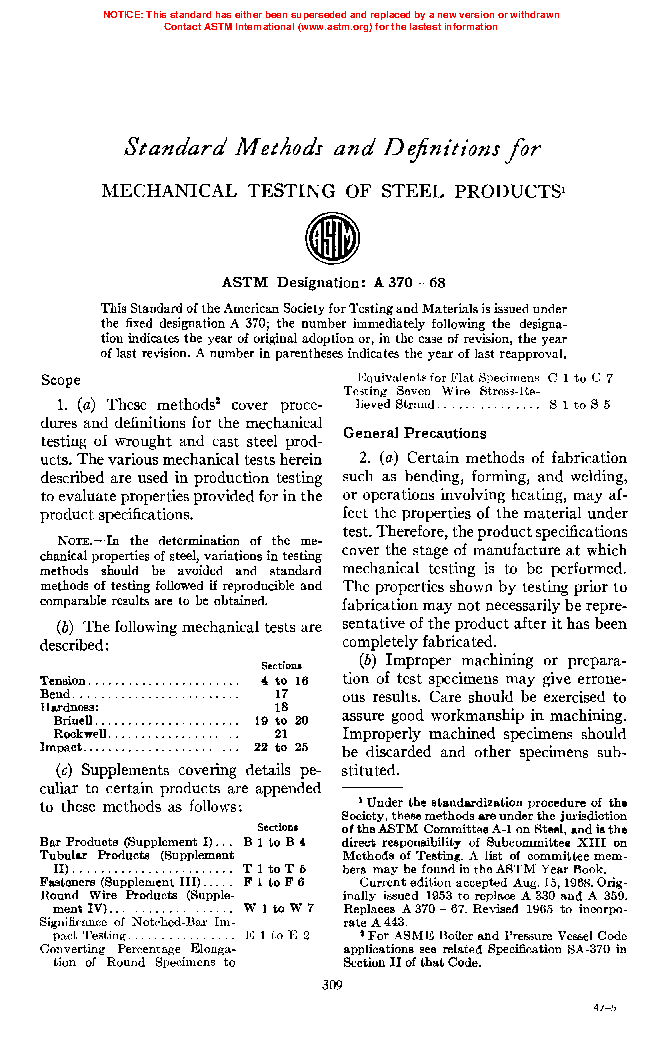 1.1 These test methods2 cover procedures and definitions for the mechanical testing of steels, stainless steels, and related alloys. The various mechanical tests herein described are used to determine properties required in the product specifications. Variations in testing methods are to be avoided, and standard methods of testing are to be followed to obtain reproducible and comparable results. In those cases in which the testing requirements for certain products are unique or at variance with these general procedures, the product specification testing requirements shall control.