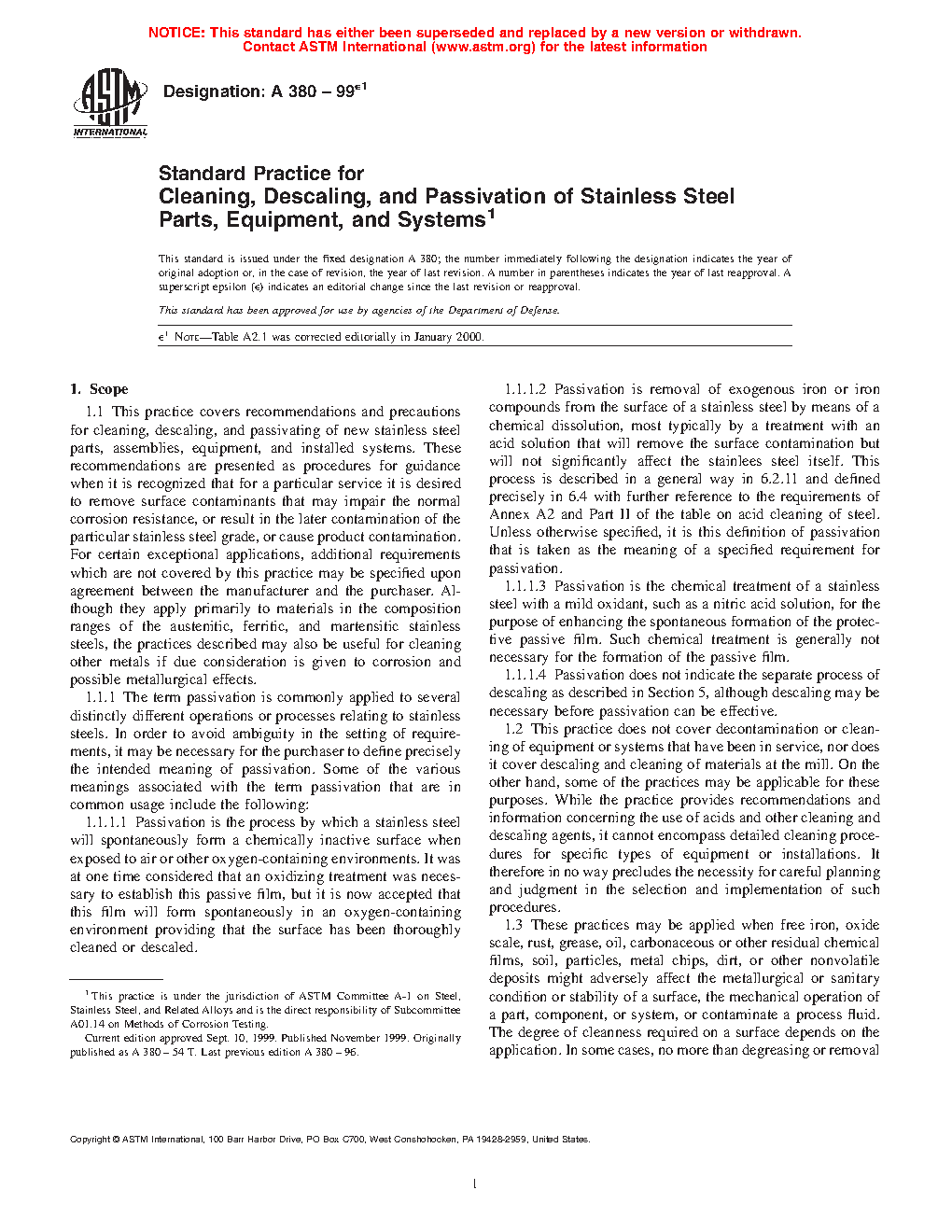 1.5 This practice provides definitions and describes good pratices for cleaning, descaling, and passivation of stainless steel parts, but does not provide tests with acceptance criteria to demonstrate that the passivation procedures have been successful. For such tests, it is appropriate to specify one of the practices listed in Specification A 967.