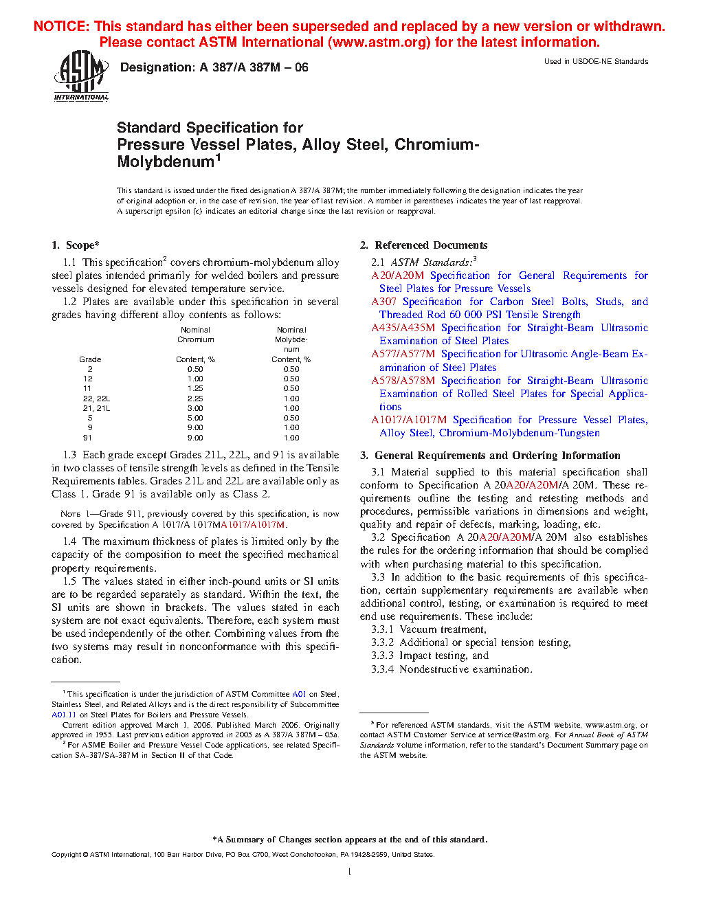 This specification covers chromium-molybdenum alloy steel plates for welded broilers and pressure vessels designed for elevated temperature service. Materials considered under this specification are available in grades 2, 12, 11, 22, 22L, 21, 21L, 5, 9 and 91. The steel materials shall be killed and shall be thermally treated. The steel specimens shall undergo heat analysis and product analysis and shall conform to the chemical requirements for carbon, manganese, phosphorus, sulfur, silicon, chromium, molybdenum, nickel, vanadium, columbium, boron, nitrogen, aluminum, titanium, and zirconium. The steel specimens shall also undergo tension tests and shall conform to the required values of tensile strength, yield strength, and elongation.