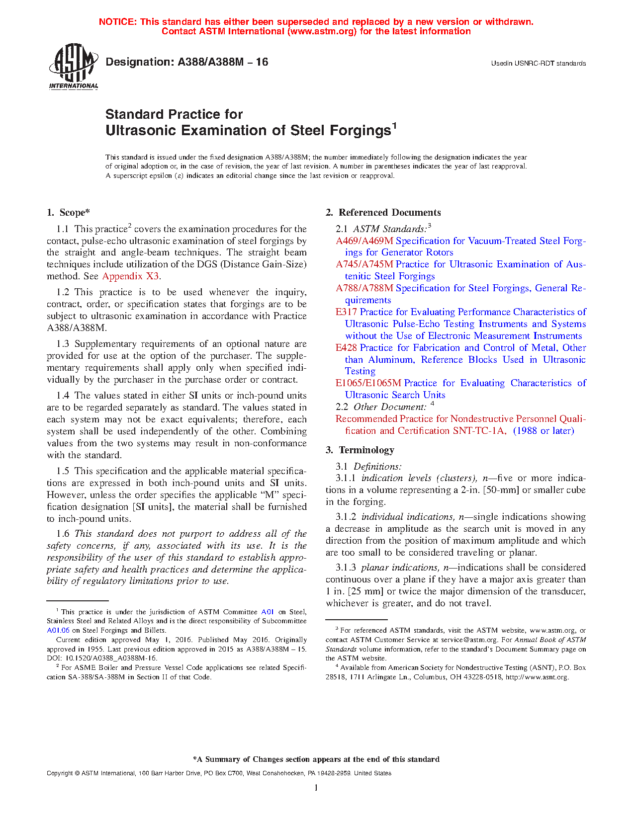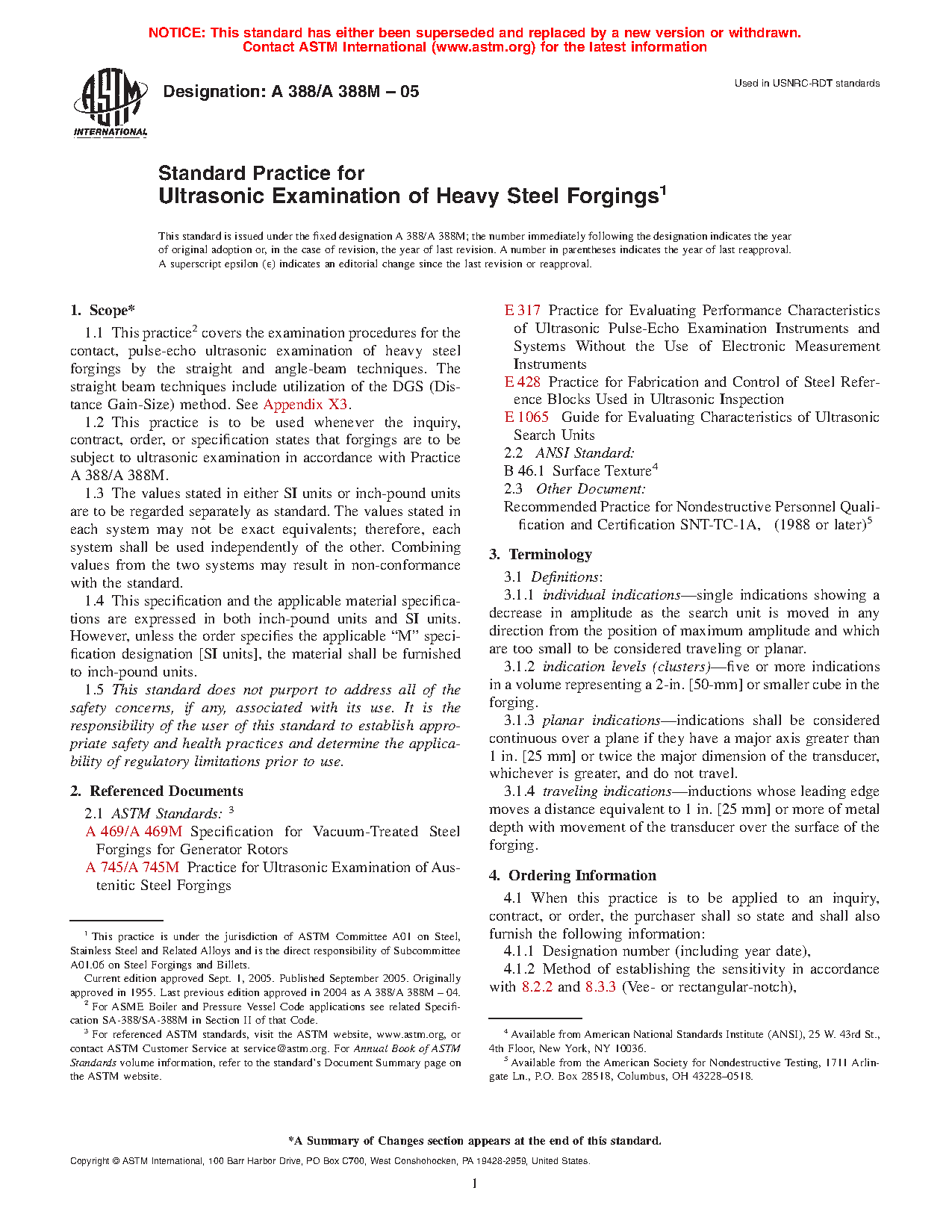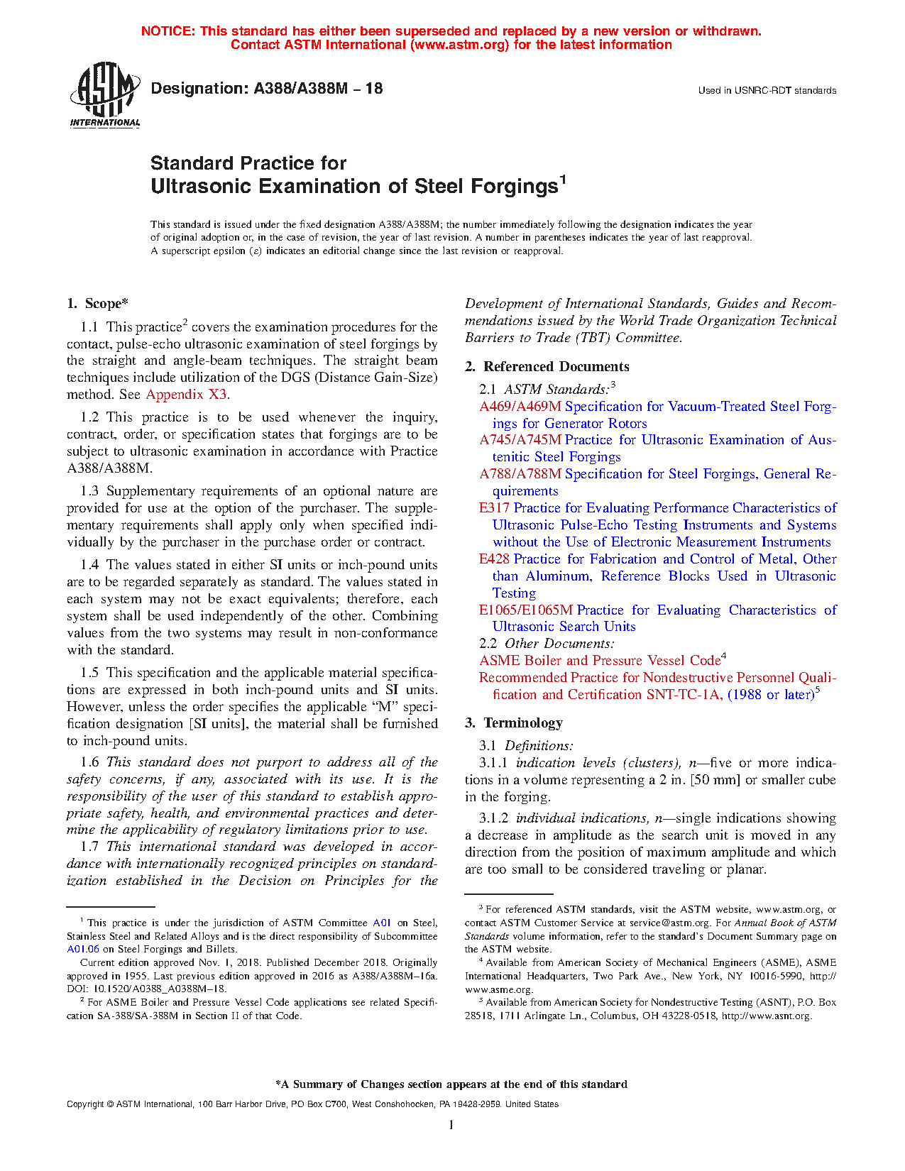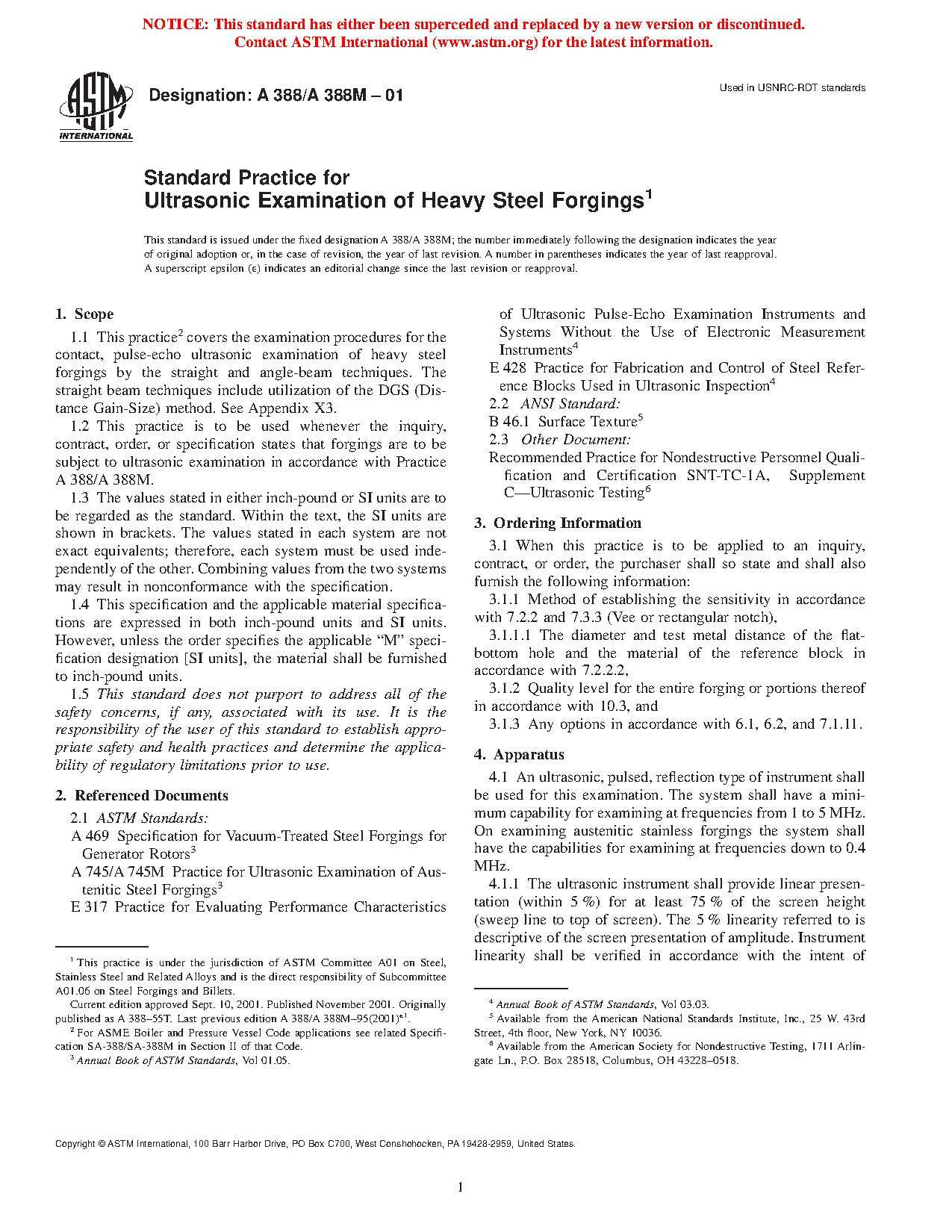 1.2 This practice is to be used whenever the inquiry, contract, order, or specification states that forgings are to be subject to ultrasonic examination in accordance with Practice A388/A388M.