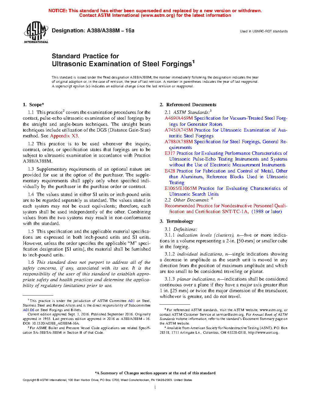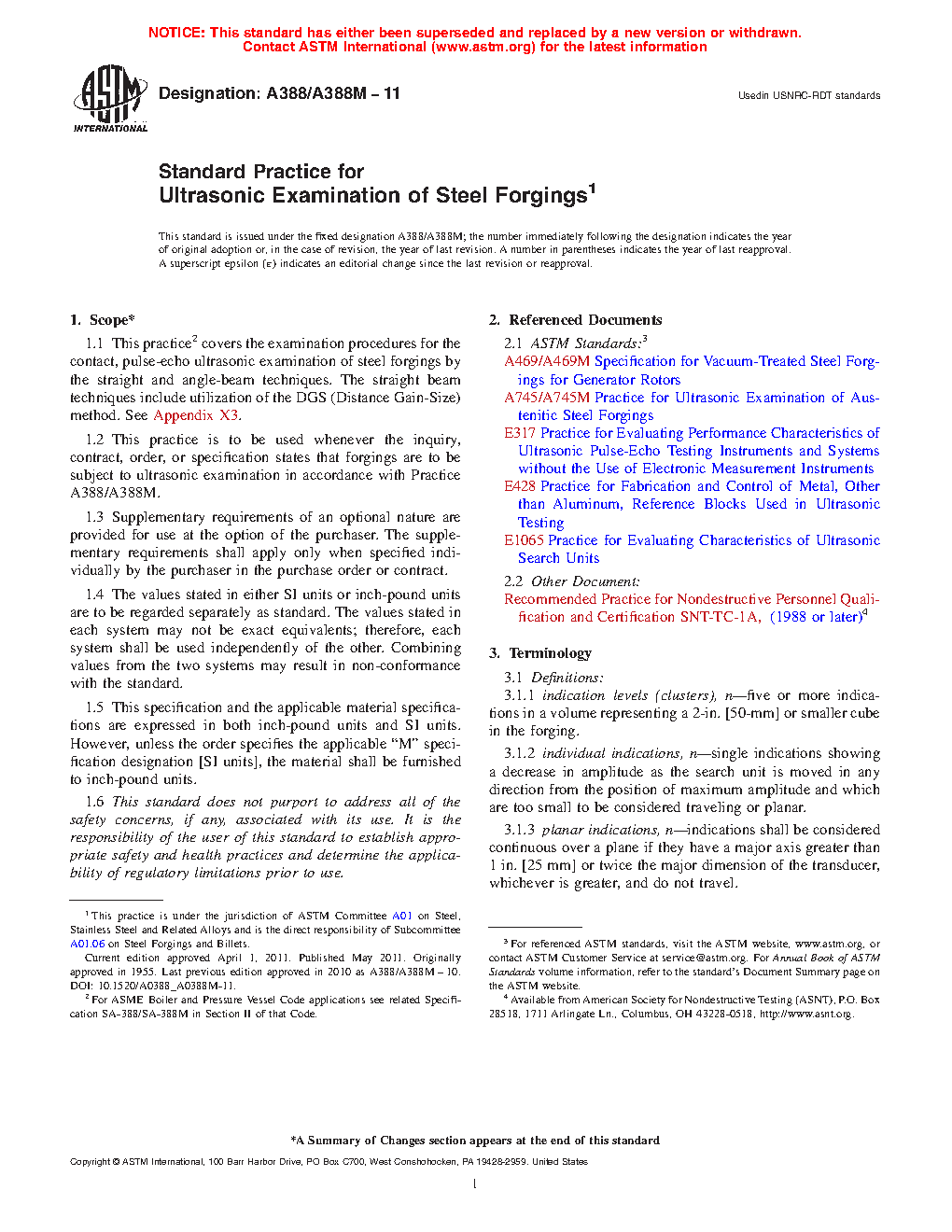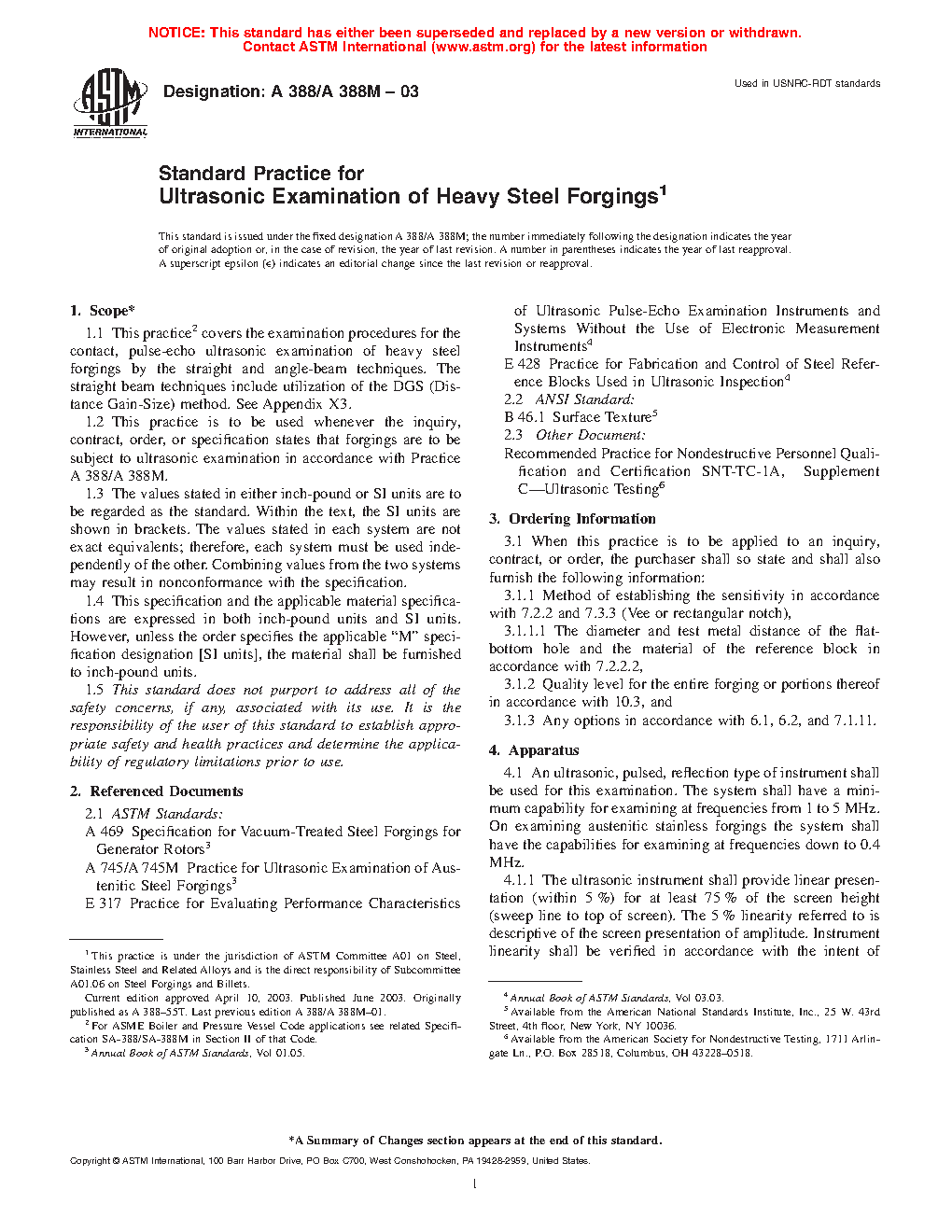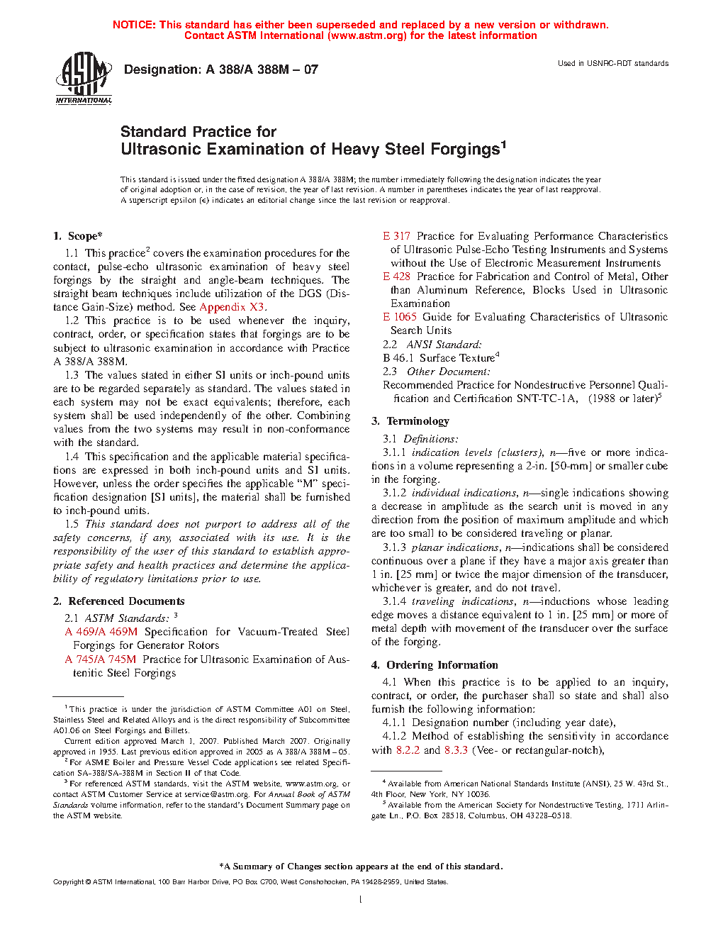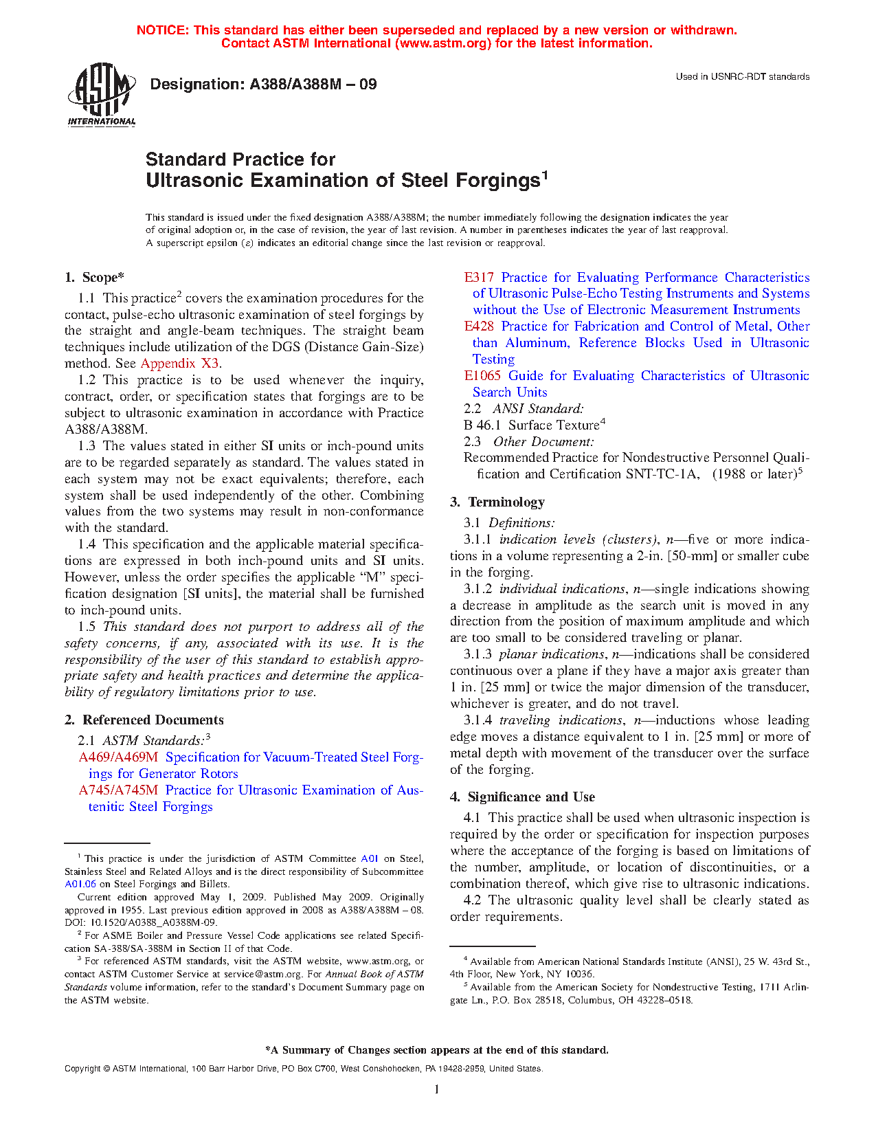 1.2 This practice is to be used whenever the inquiry, contract, order, or specification states that forgings are to be subject to ultrasonic examination in accordance with Practice A388/A388M.