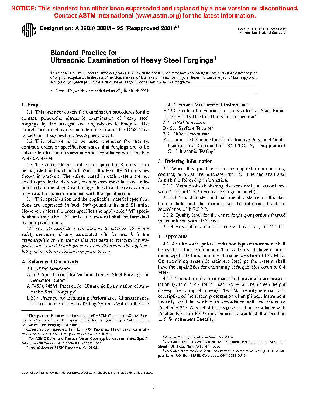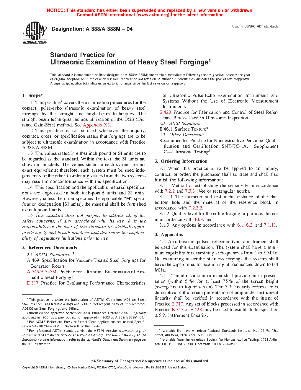 1.1 This practice2 covers the examination procedures for the contact, pulse-echo ultrasonic examination of steel forgings by the straight and angle-beam techniques. The straight beam techniques include utilization of the DGS (Distance Gain-Size) method. See Appendix X3.