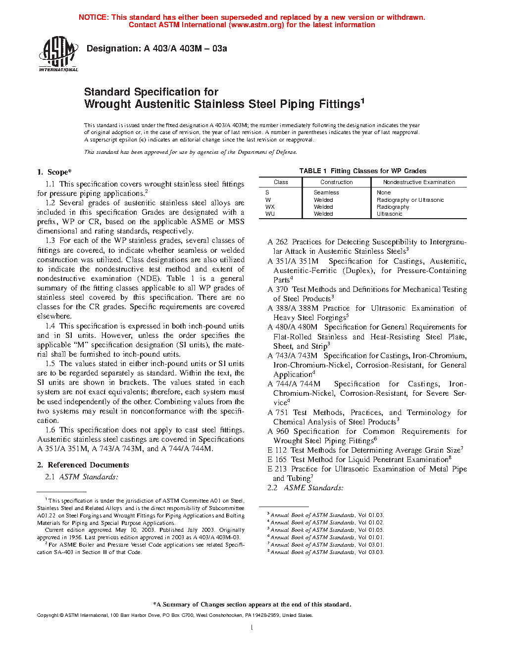1.3 For each of the WP stainless grades, several classes of fittings are covered, to indicate whether seamless or welded construction was utilized. Class designations are also utilized to indicate the nondestructive test method and extent of nondestructive examination (NDE). Table 1 is a general summary of the fitting classes applicable to all WP grades of stainless steel covered by this specification. There are no classes for the CR grades. Specific requirements are covered elsewhere.