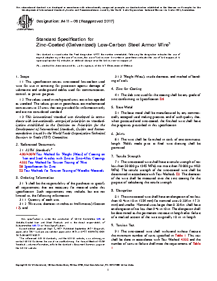 1.1 This specification covers zinc-coated low-carbon steel wire for use in armoring for protection against damage of submarine and underground cables used for communication, control, or power purposes.
