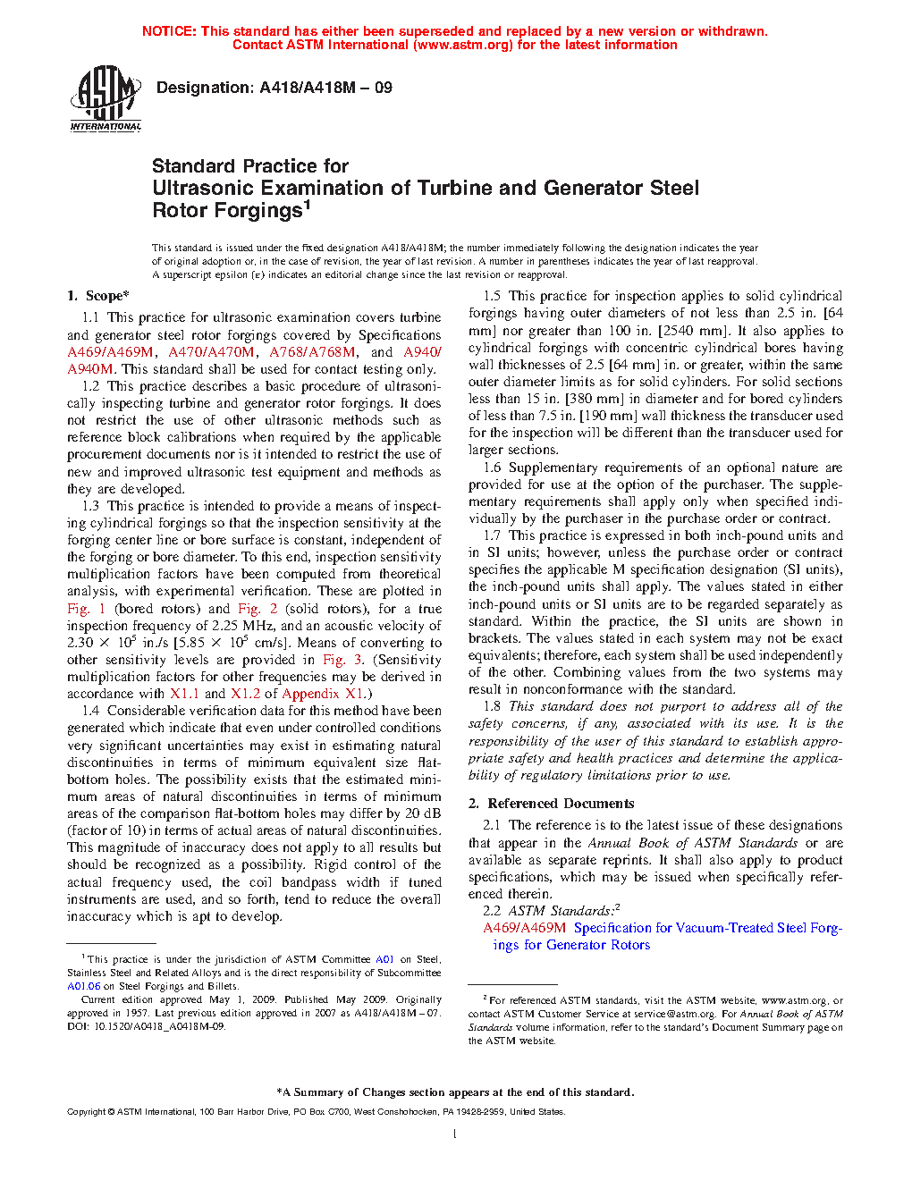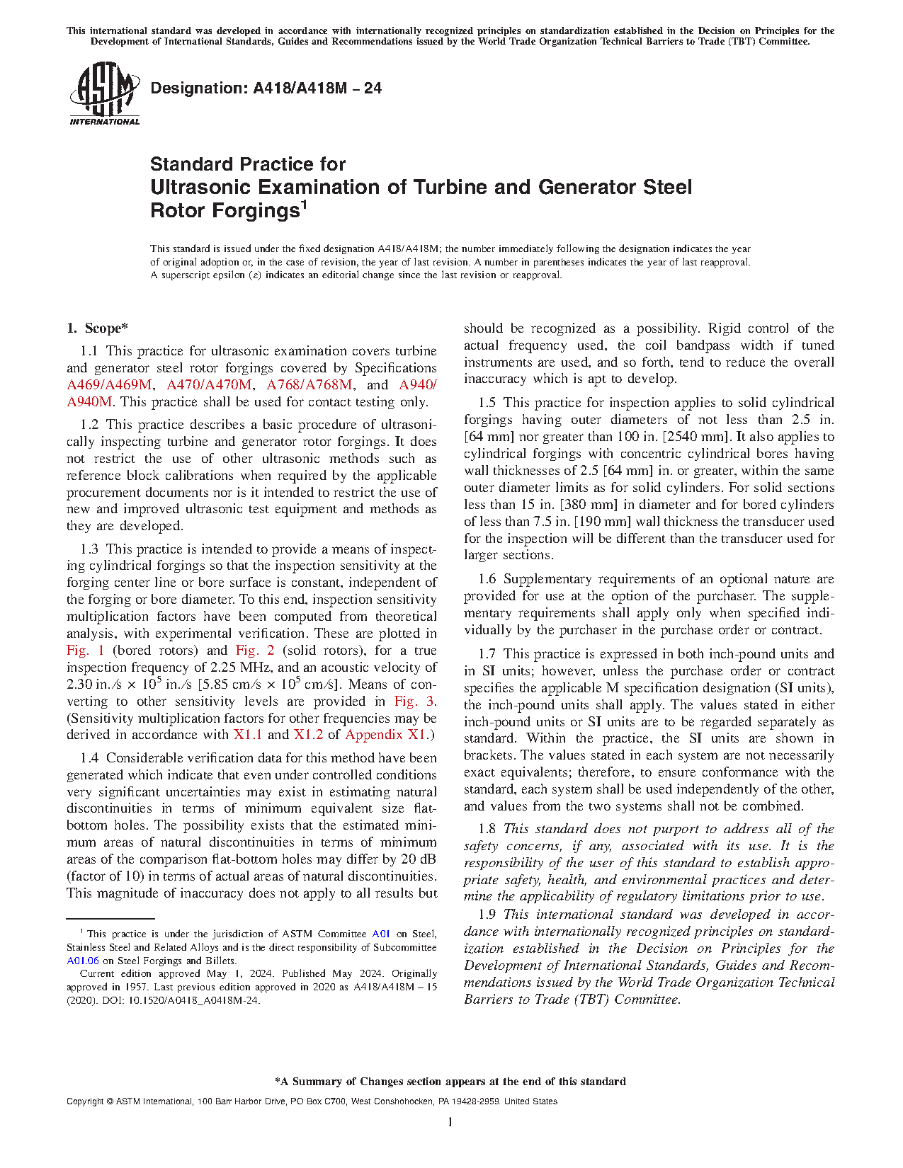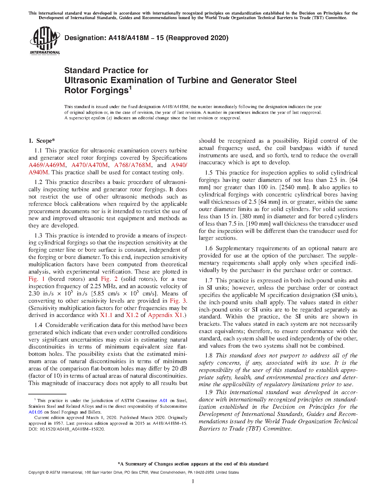 1.2 This practice describes a basic procedure of ultrasonically inspecting turbine and generator rotor forgings. It shall in no way restrict the use of other ultrasonic methods such as reference block calibrations when required by the applicable procurement documents nor is it intended to restrict the use of new and improved ultrasonic test equipment and methods as they are developed. The procedure utilizes different calibration techniques than had been used in previous issues. The frequency or amplitudes of recordable indications should not be interpreted necessarily as a change in quality of the product being examined.