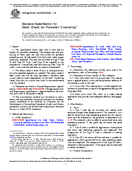 1.1 This specification covers sheet steel in coils and cut lengths for porcelain enameling. The compositions and processing of these steels are such that articles for porcelain enameling may be fabricated from them and, under proper conditions, enameled. The steels are furnished as Type I, Type II, and Type III. Type I and Type II are supplied in two designations, Commercial Steel and Drawing Steel. Type III steel is interstitial-free and does not require a designation.