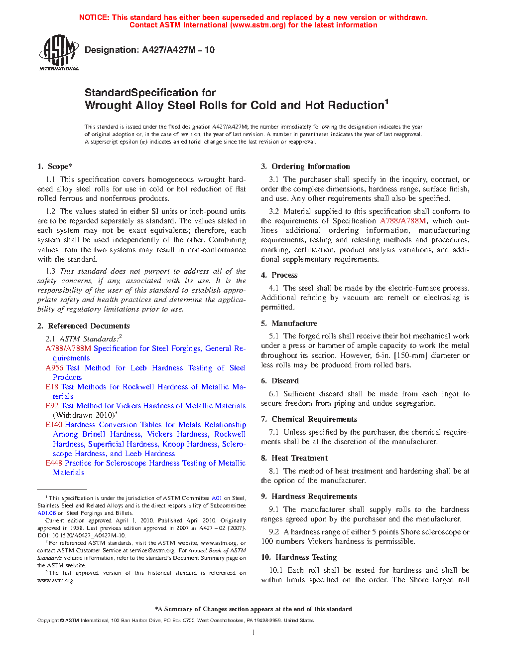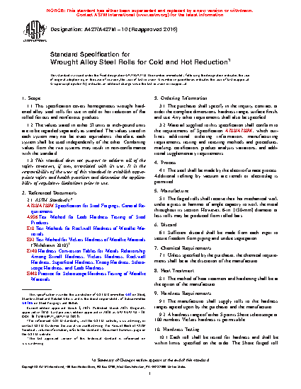 1.1 This specification covers homogeneous wrought hardened alloy steel rolls for use in cold or hot reduction of flat rolled ferrous and nonferrous products.