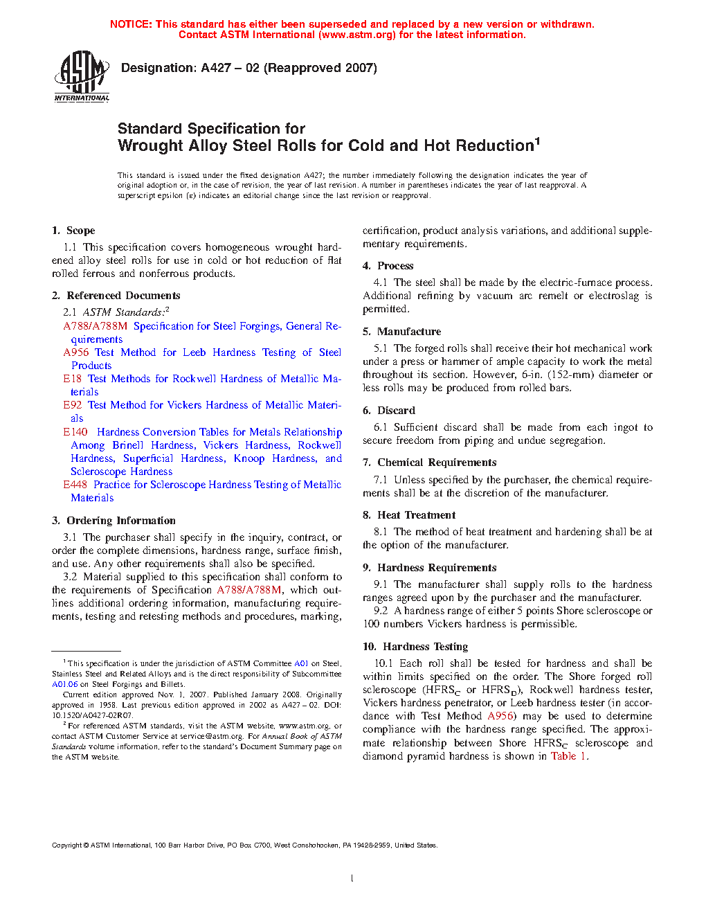 1.1 This specification covers homogeneous wrought hardened alloy steel rolls for use in cold or hot reduction of flat rolled ferrous and nonferrous products.