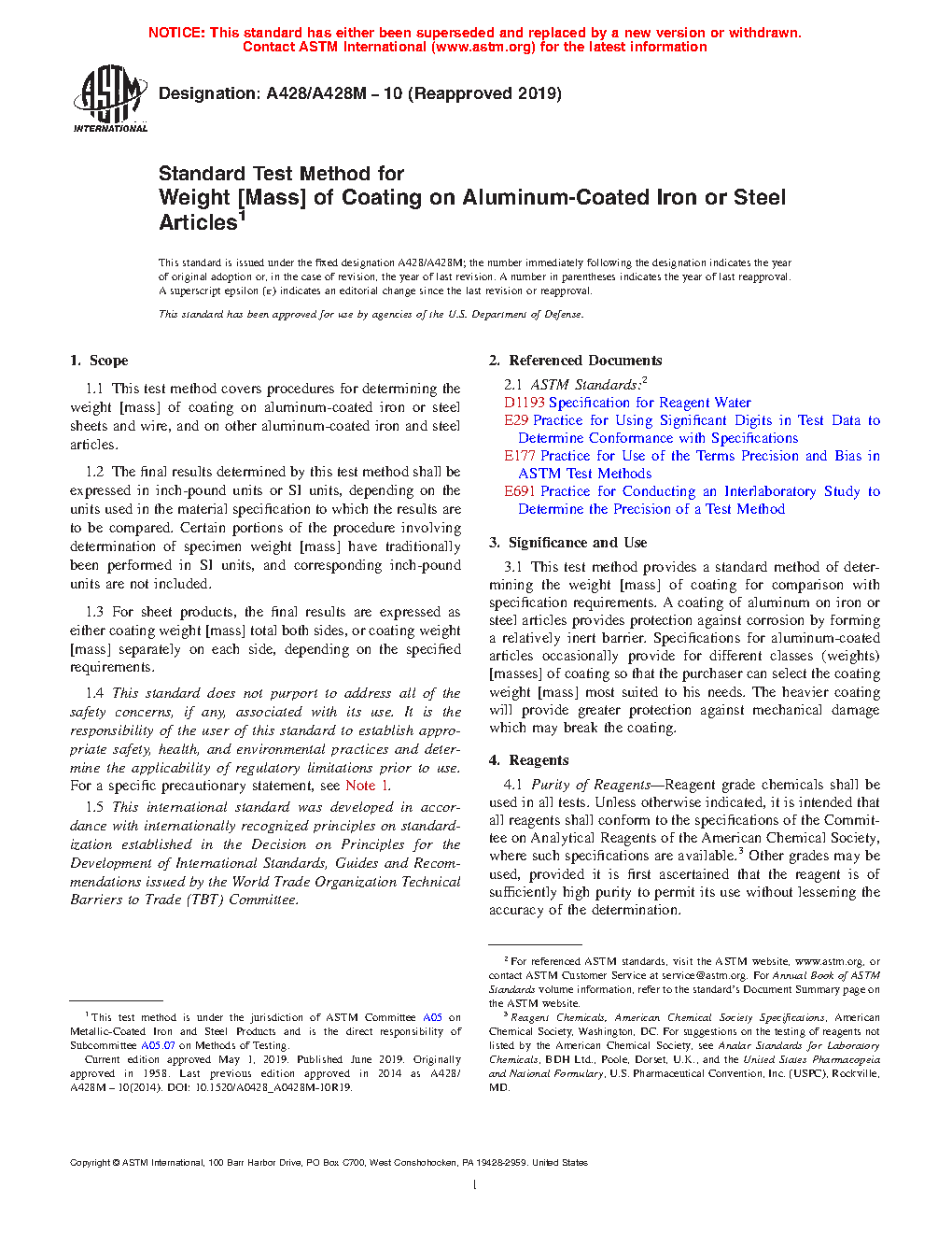 1.1 This test method covers procedures for determining the weight [mass] of coating on aluminum-coated iron or steel sheets and wire, and on other aluminum-coated iron and steel articles.