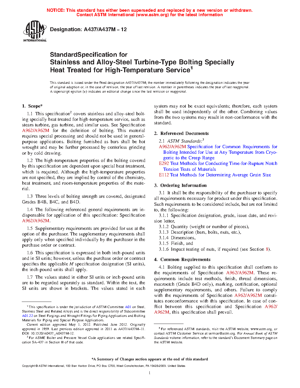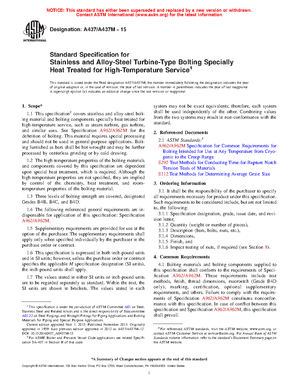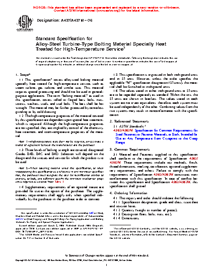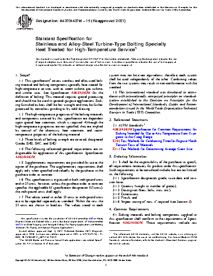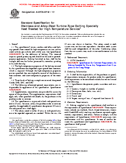 1.1Â This specification covers stainless and alloy-steel bolting material and bolting components specially heat treated for high-temperature service, such as steam turbine, gas turbine, and similar uses. See Specification A962/A962M for the definition of bolting. This material requires special processing and should not be used in general-purpose applications. Bolting furnished as bars shall be hot wrought and may be further processed by centerless grinding or by cold drawing.